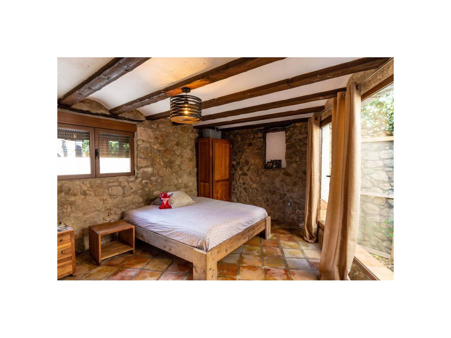 The building has a fireplace, 2 pellet stoves, air conditioning (this is hardly necessary due to the very thick walls) and mosquito nets. The chalet is oriented to the south.