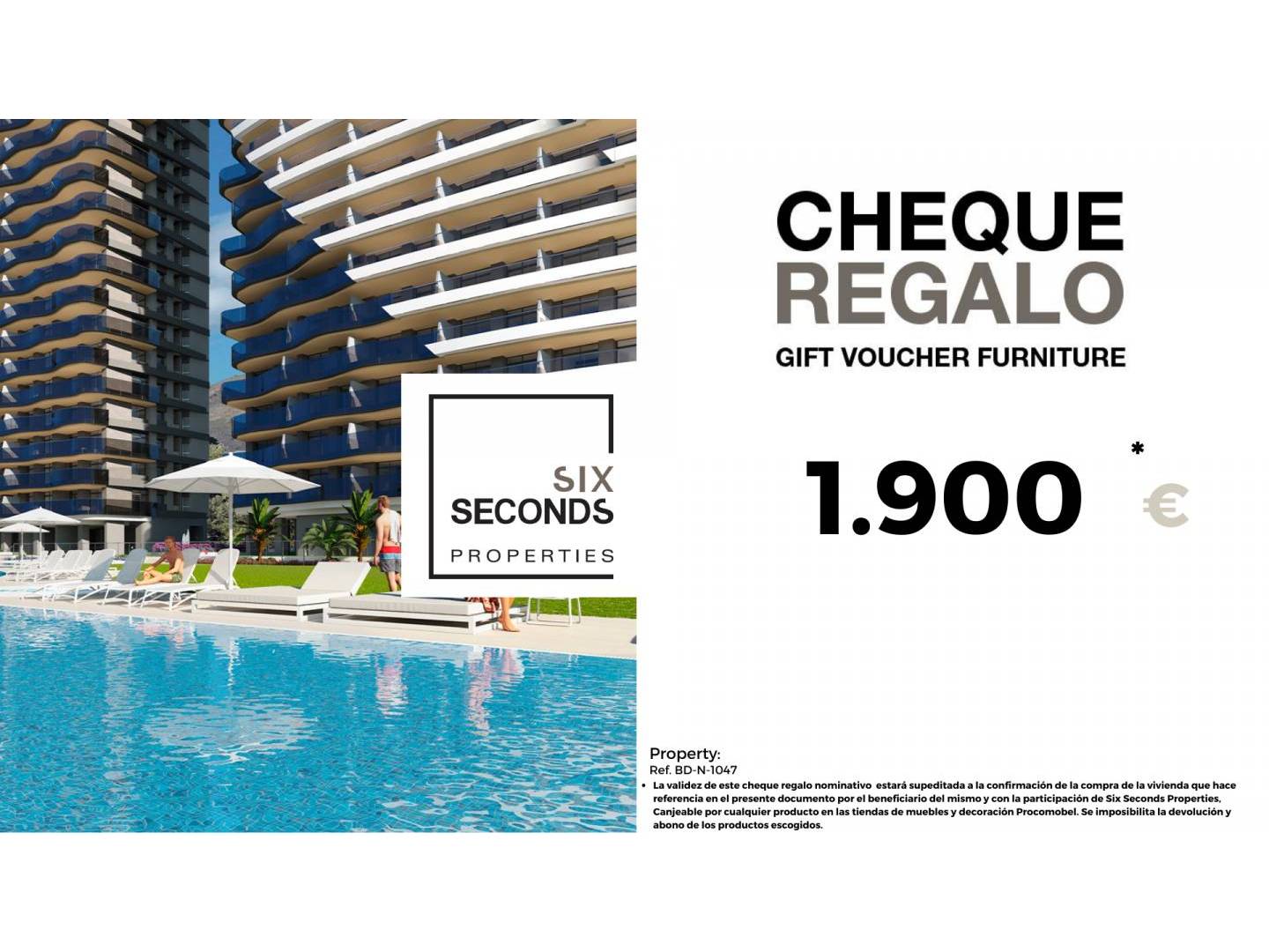 At Six Seconds Properties we help you turn your new property into the house of your dreams, giving you a gift voucher worth €1,900 worth of furniture and a technical visit to the home, where our technical team will advise you on the possibilities of improving the property. living place. Totally free !!