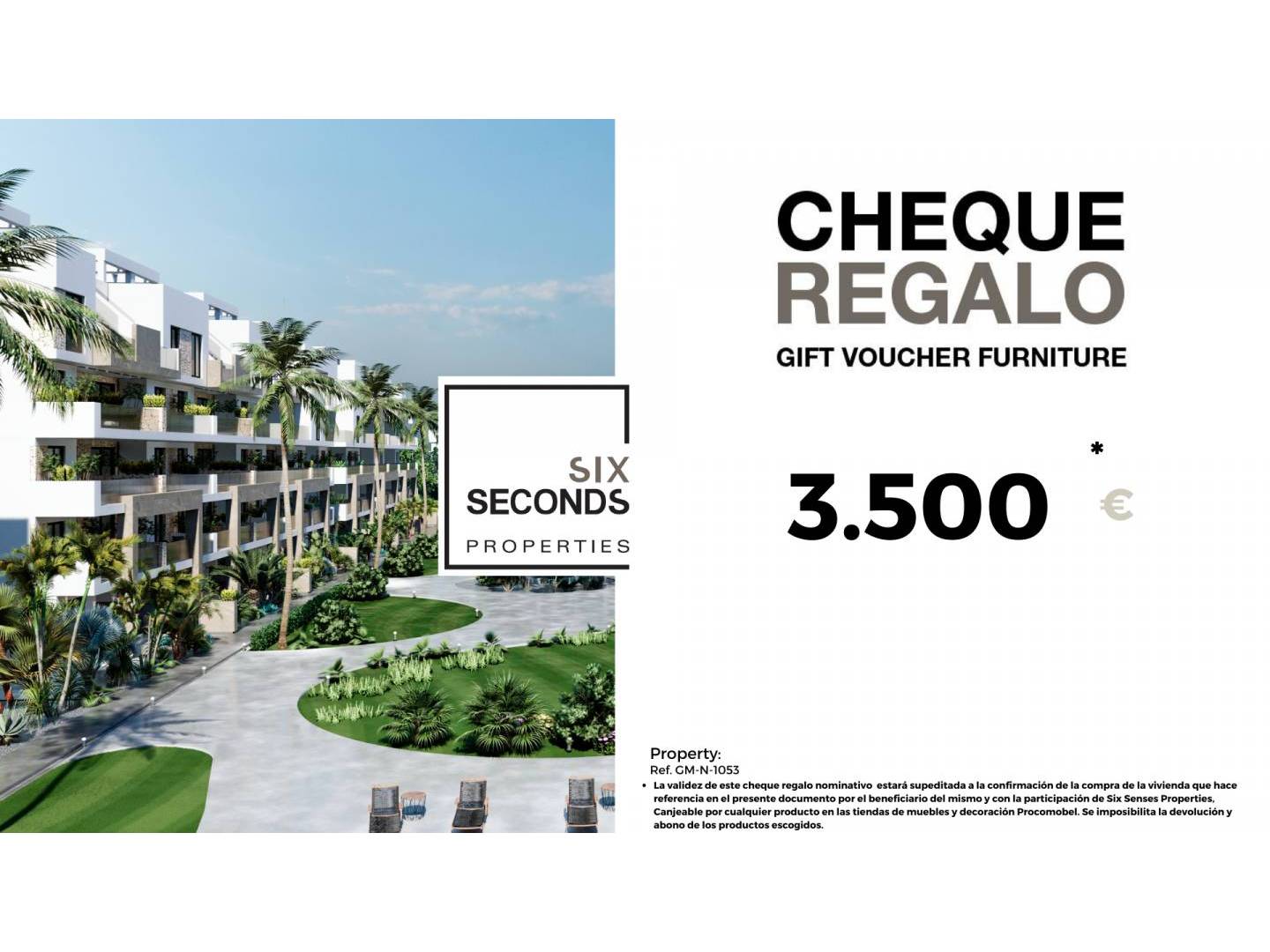 At Six Seconds Properties we help you turn your new property into the house of your dreams, giving you a €3,500 furniture gift voucher and a technical visit from the design department to the home, where our technical team will advise you on the possibilities of improving and decorating your property. Totally free!!