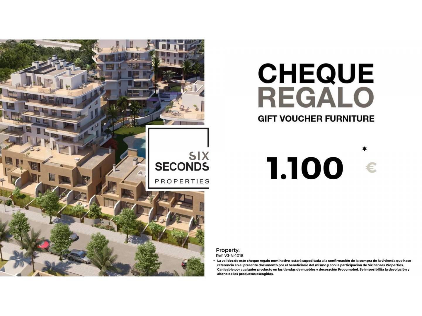 At Six Seconds Properties (965059685), we'll help you turn your new property into the home of your dreams by giving you a €1,100 furniture gift voucher and a technical visit to the property, where our technical team will advise you on home improvement options. Completely free!