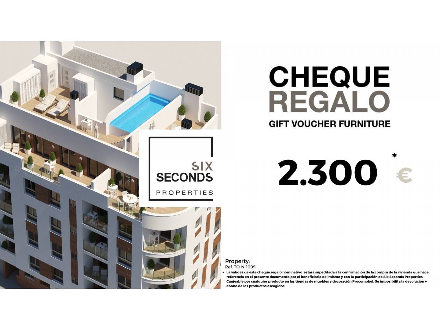 At Six Seconds Properties we help you turn your new property into the house of your dreams, giving you a gift voucher for furniture in the amount of €2,300 and a technical visit to the home, where our technical team will advise you on the possibilities of improving your the House. Totally free!!