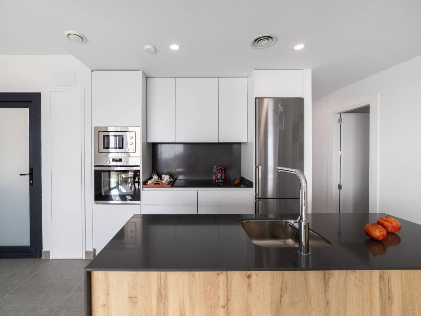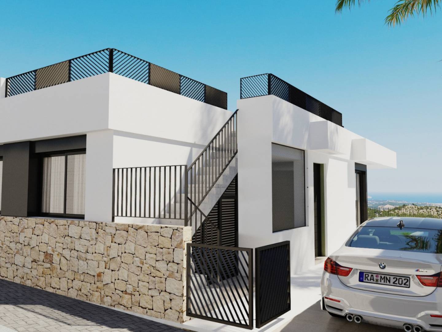 Located in the picturesque municipality of Polop , this contemporary designed villa combines comfort and elegance, offering panoramic views where the Mediterranean Sea meets the imposing Mount Ponoig . Harmoniously distributed, it has three bright bedrooms, a modern American kitchen that merges with the living-dining room, and two high-quality bathrooms. The villa has a great advantage: all its rooms are distributed on a single floor, which makes everyday life easier. In addition, it offers a relaxing garden space on a plot of 46 square meters and the possibility of adding a solarium and a private pool for a superior luxury experience. This villa not only offers a comfortable and functional residence, but also provides an enriching community experience, thanks to its refreshing community pools, common areas and social club.