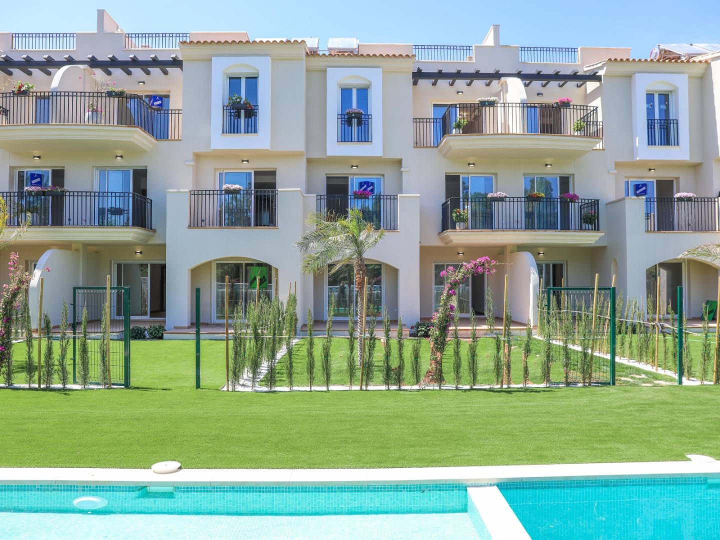 This ground floor apartment is sold turnkey and consists of 2 bedrooms and 1 bathroom , kitchen, large living room, terrace, garden and separate room with connection for a washing machine. It also has a hot water supply through a boiler with a solar panel. The apartments offer first-class facilities, private parking spaces and a communal pool .