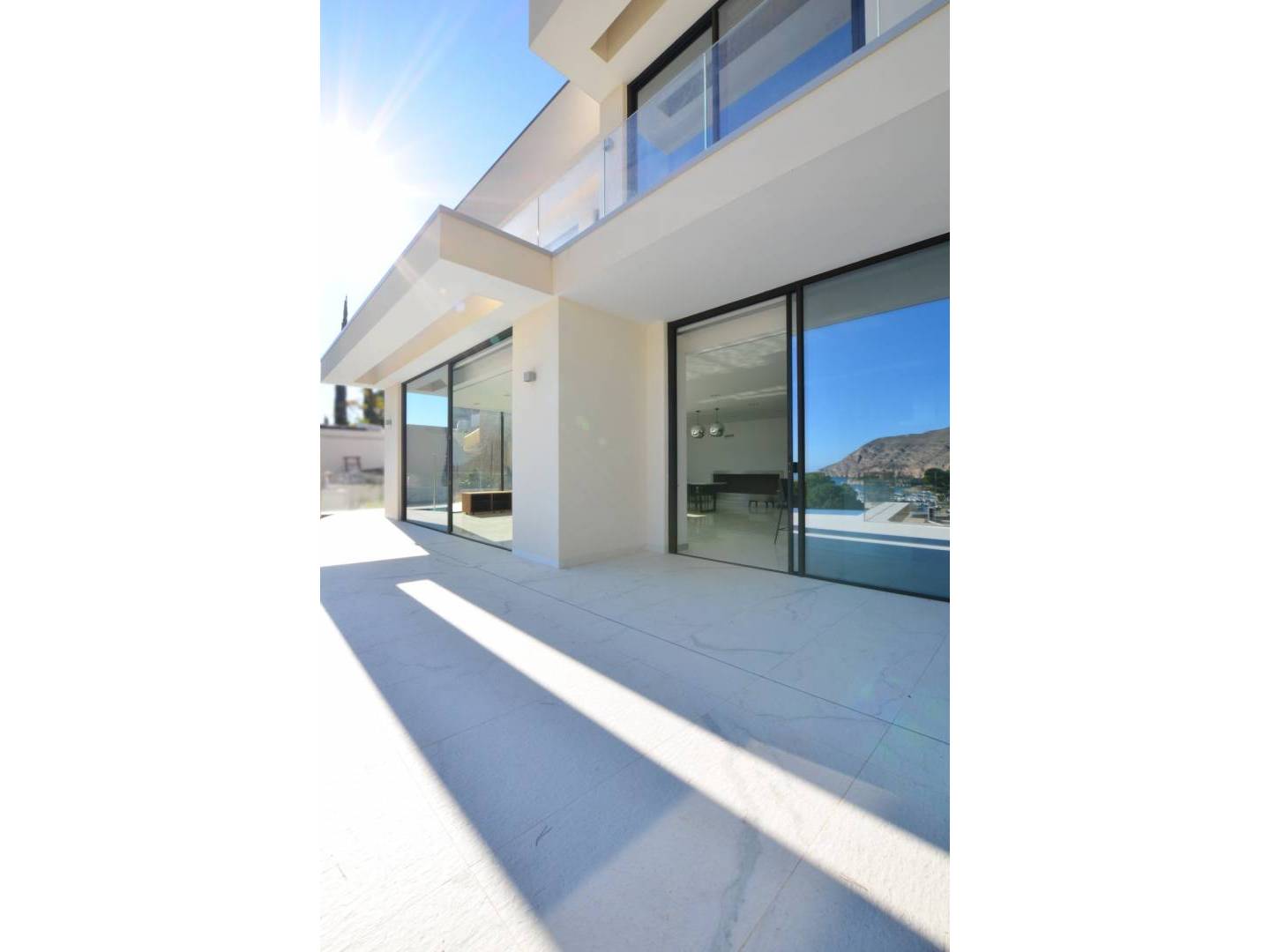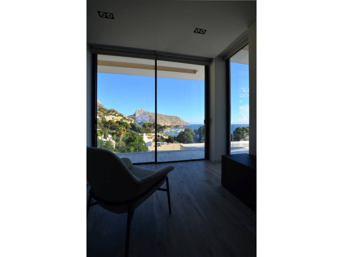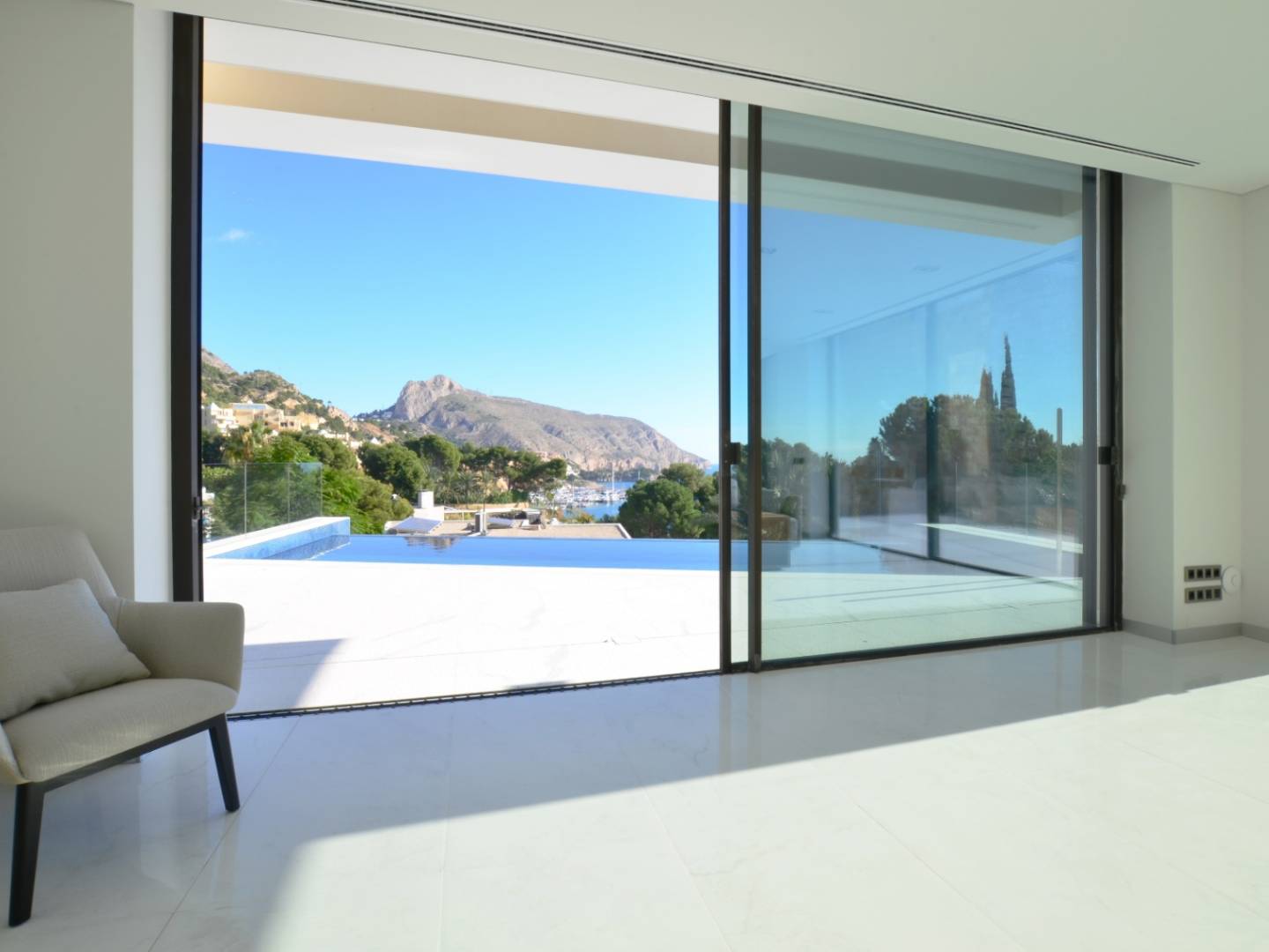 Splendid three- level residence with impressive views of the sea and the port, located in the Mascarat urbanization, near the center of Altea . A few steps from the beach and a short distance from the MasyMas supermarket, this refined home was built in 2020 and completed in 2021 , standing out for its high- end construction and decoration . With a total area of 353 m2 and a plot of 965 m2 , the villa includes a beautiful infinity pool and a garage for two vehicles .