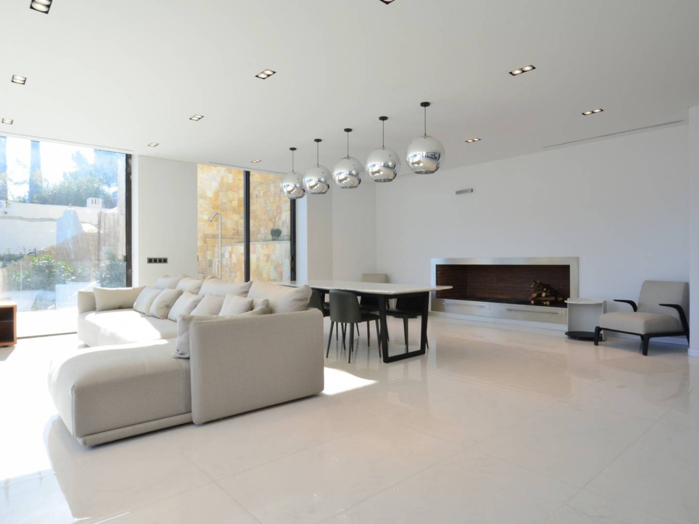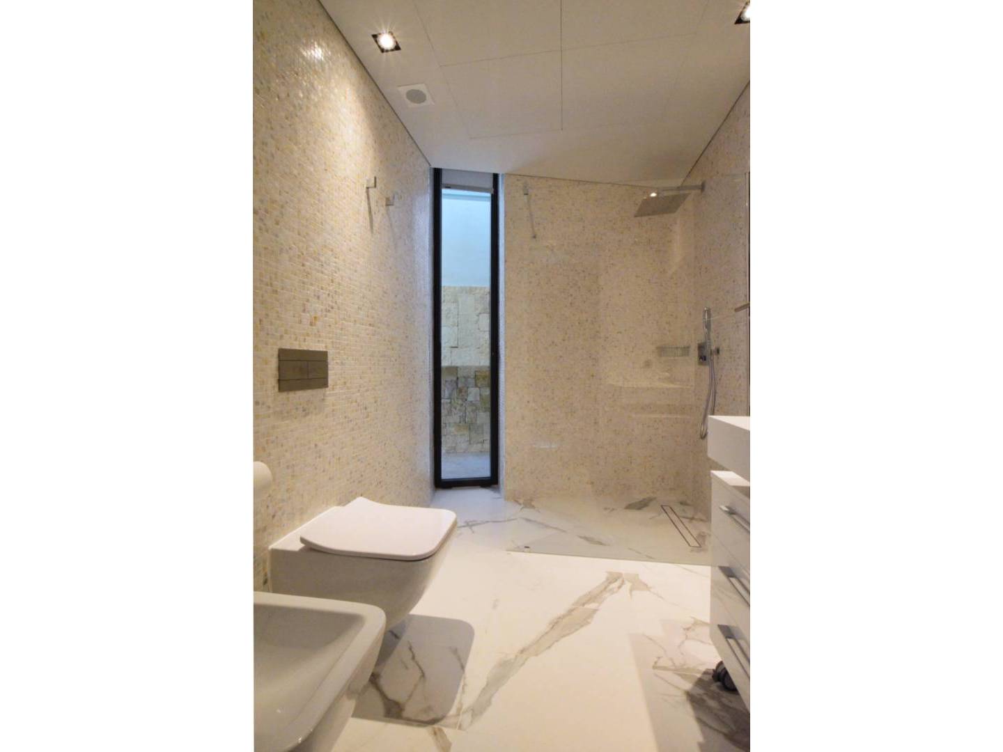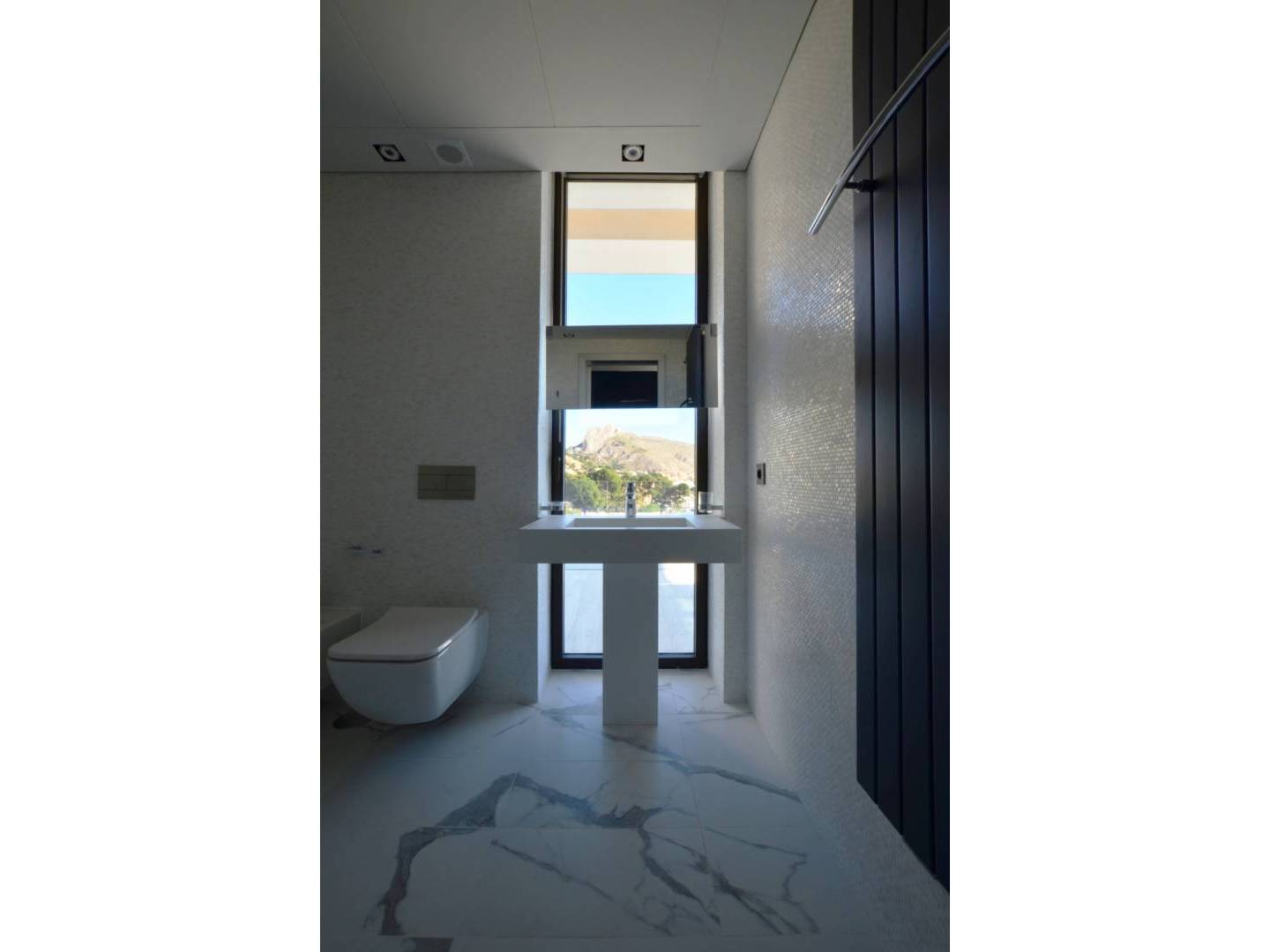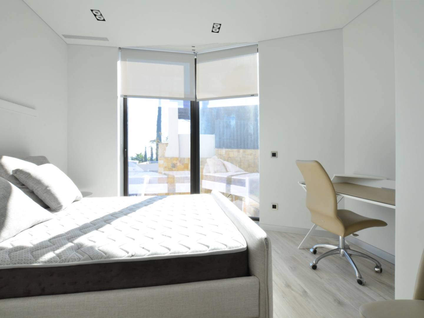 On the ground floor there is a guest bedroom with a large dressing room and bathroom, a Finnish sauna and several service rooms. The villa has an "A" energy efficiency certification , built with modern materials of the highest quality and equipped with Miele brand appliances . Technical features include Technal aluminum windows with double glazing , Somfi motorized blinds , Schluter underfloor heating , Mitsubishi air conditioning with heat recovery system, Zhender mechanical ventilation , solar panels , heat pumps , Airzone intelligent climate control system , Tegi video intercom with application , video surveillance , cameras and alarm , as well as fiber optic internet connection .
