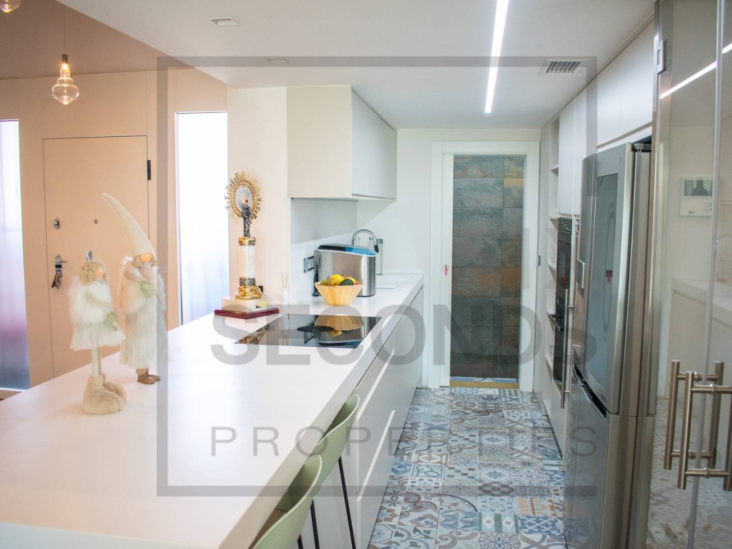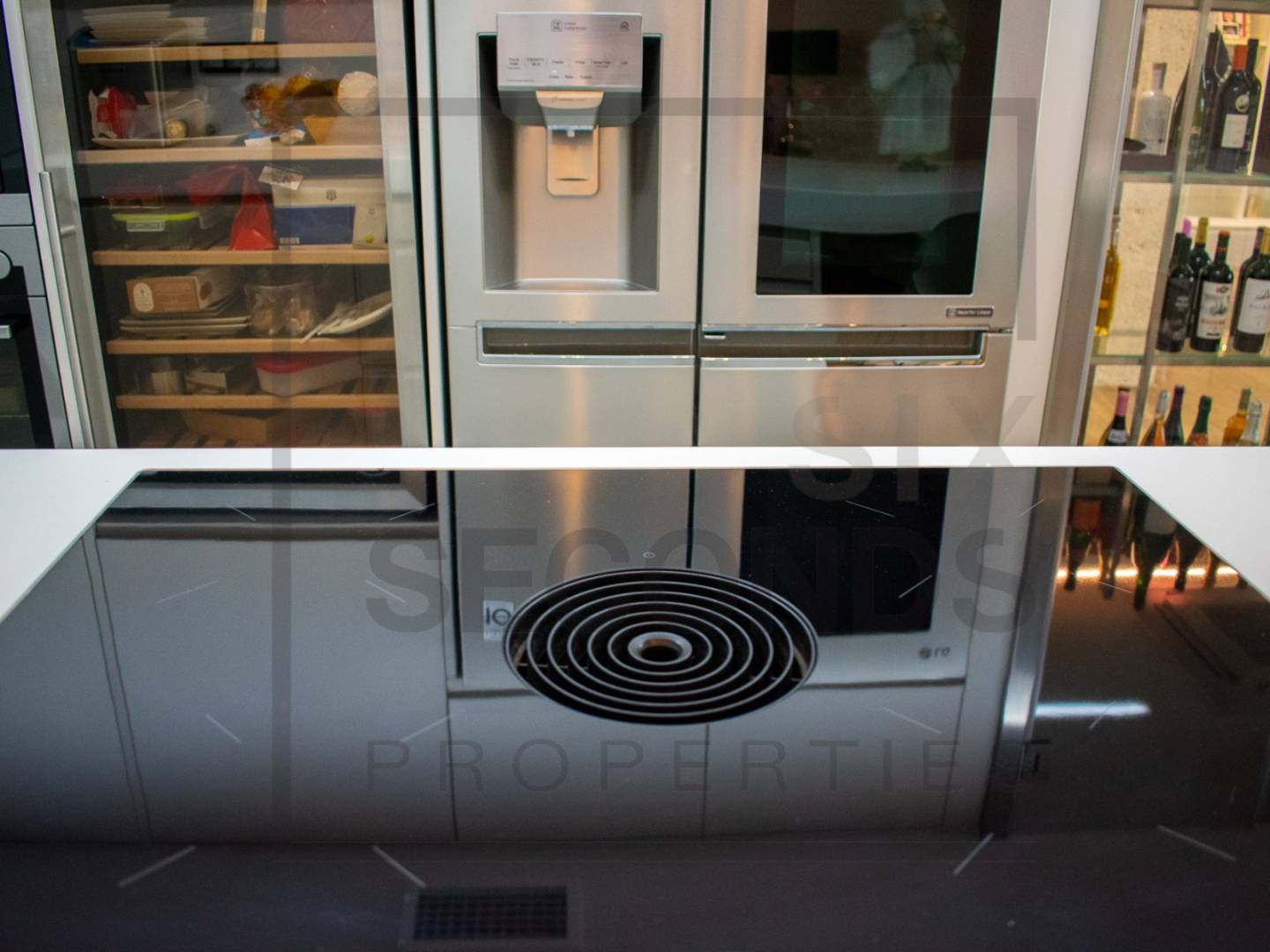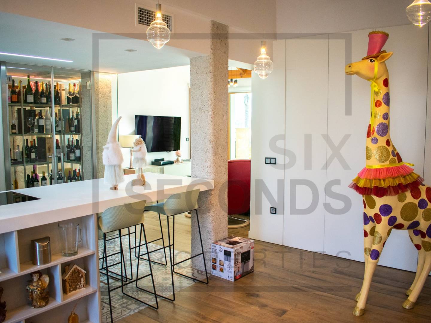 The separate kitchen with a breakfast bar allows you to enjoy cooking in complete comfort. It also features a wine cellar / display case for storing and showcasing your favorite wines.