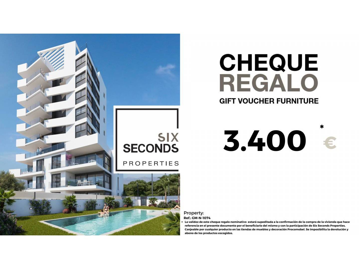 At Six Seconds Properties we help you transform your new home into the home of your dreams by offering you a furniture gift voucher for an amount of €4,200 . and a technical visit to the home design office, where our technical team will advise you on your home improvement and furnishing options. Totally free!!
