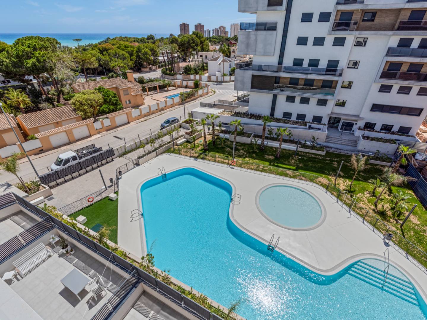 Enjoy the modern air conditioning, aerothermal system for hot water, parking , storage room and exceptional common areas: heated and outdoor swimming pools , gym , sports area, children's games , gourmet room and chill out on the roof.