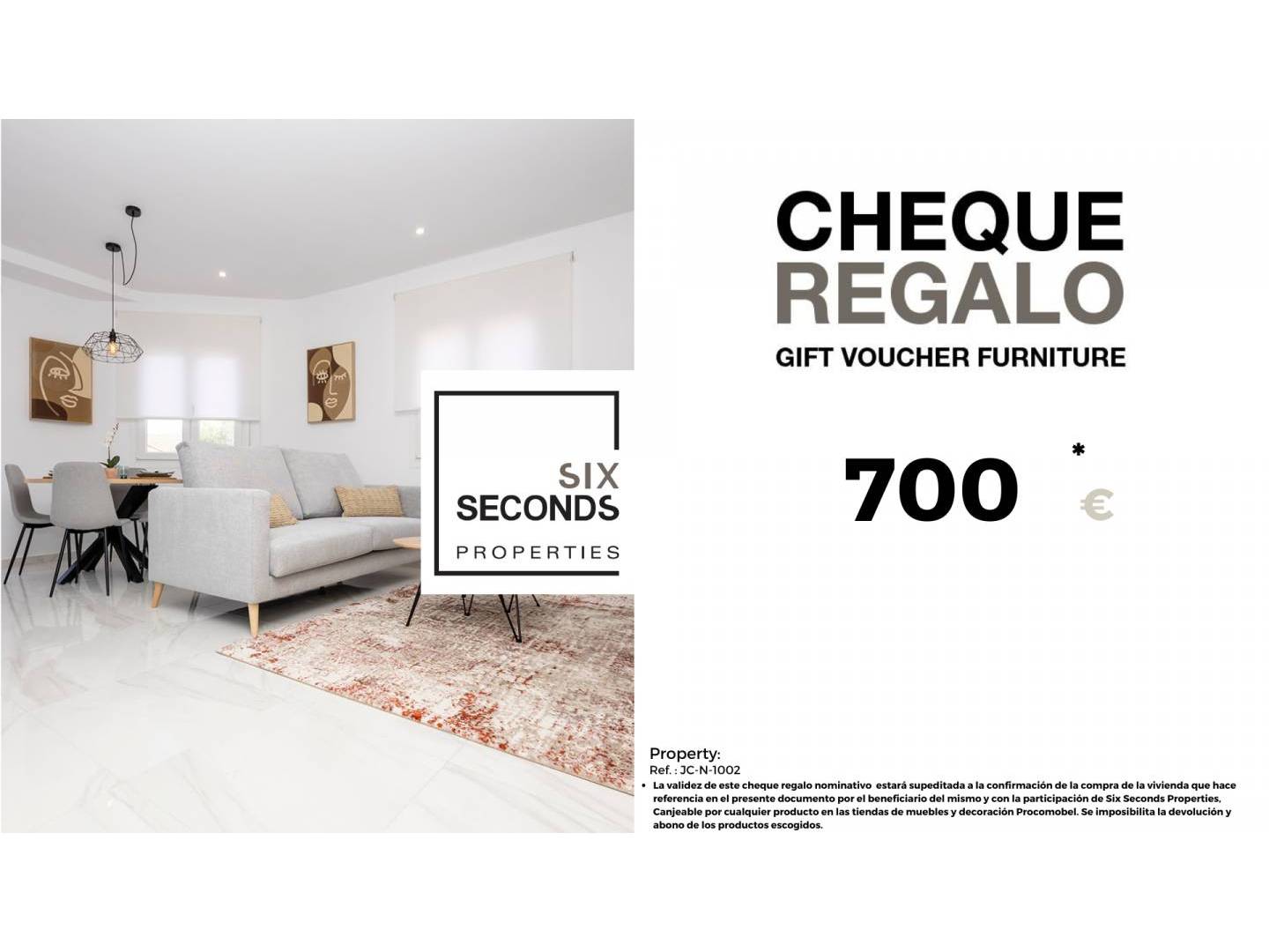 At Six Seconds Properties we help you turn your new property into the home of your dreams, giving you a gift voucher worth €700 worth of furniture and a technical visit to the home, where our technical team will advise you on the possibilities of improving the property. living place. Totally free!!