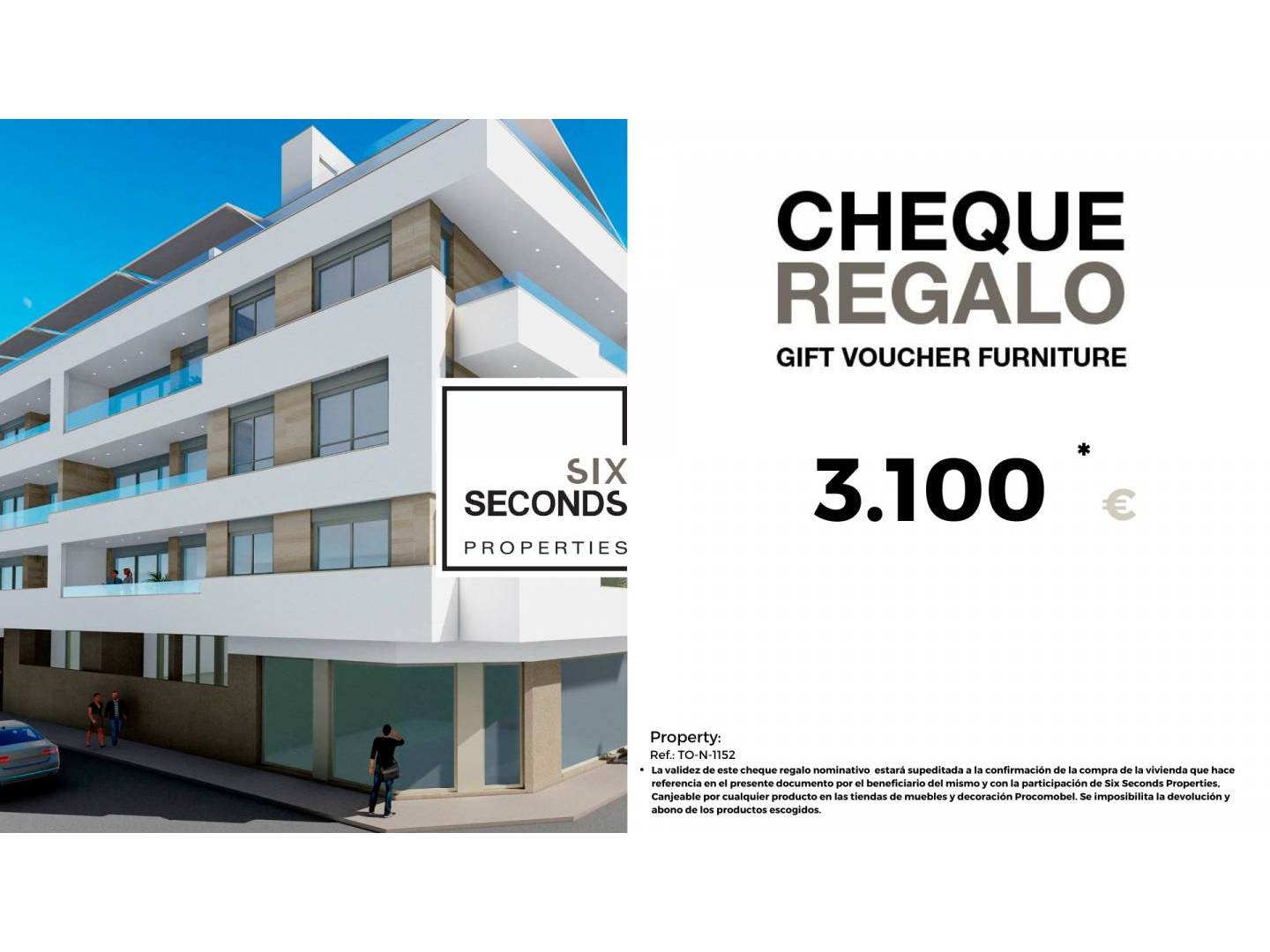 At Six Seconds Properties we help you turn your new property into the home of your dreams, giving you a gift voucher worth €3,100 worth of furniture and a technical visit to the property, where our technical team will advise you on the possibilities of improving the home. Totally free!