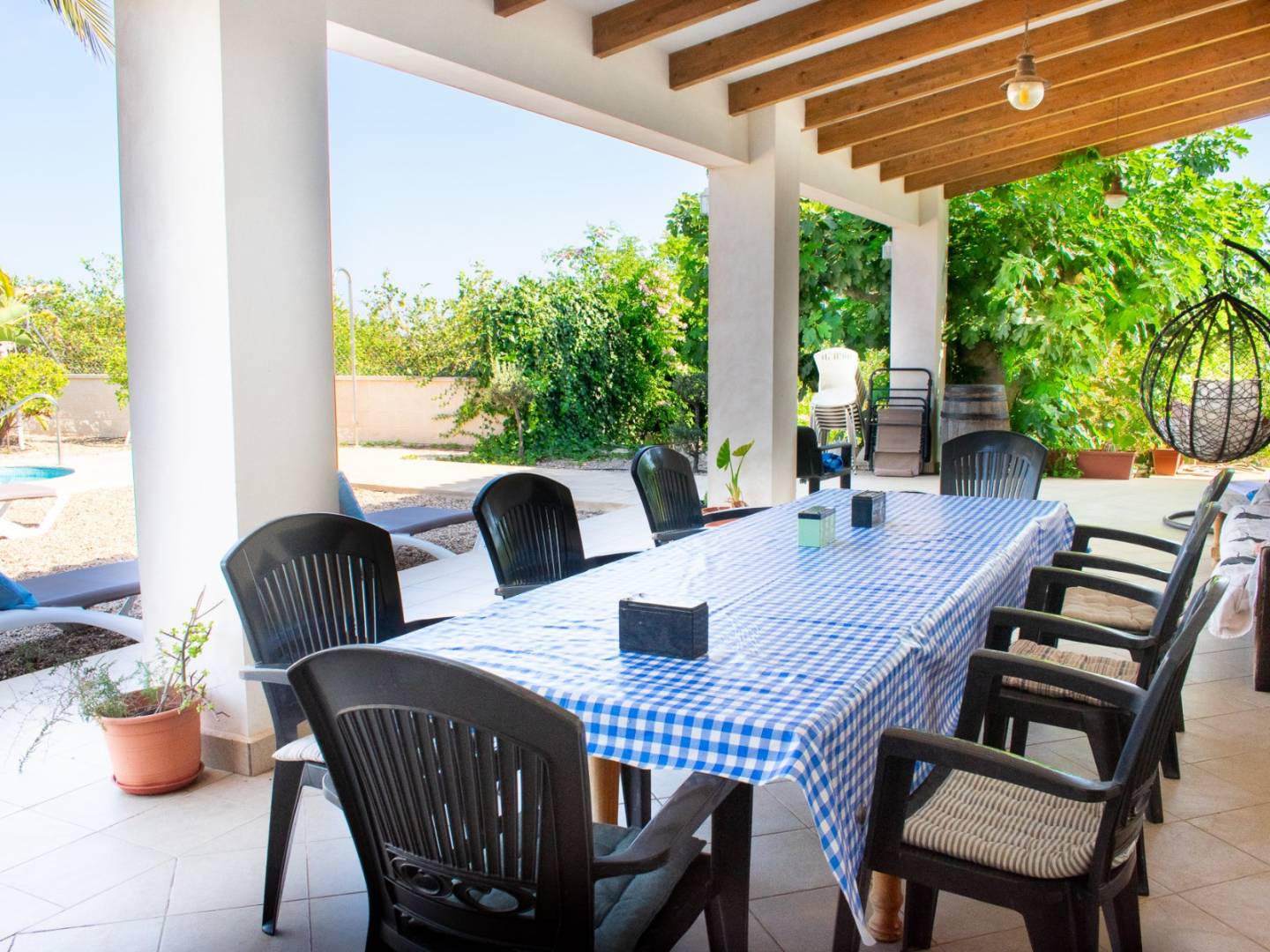 The property stands out for its large outdoor space. A covered porch offers a perfect area to relax or enjoy al fresco meals. The garden area features a private, irregularly shaped pool, ideal for cooling off on the hottest days. In addition, a second bathroom with outdoor access, in the pool area, adds convenience for pool days and outdoor activities.