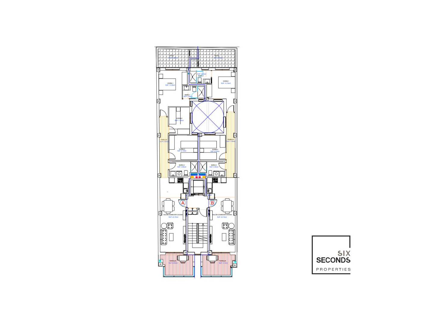 The residential complex has 12 apartments, two per floor . The apartments have 2/3 bedrooms and 2 bathrooms with large terraces and a communal pool on the roof of the building.