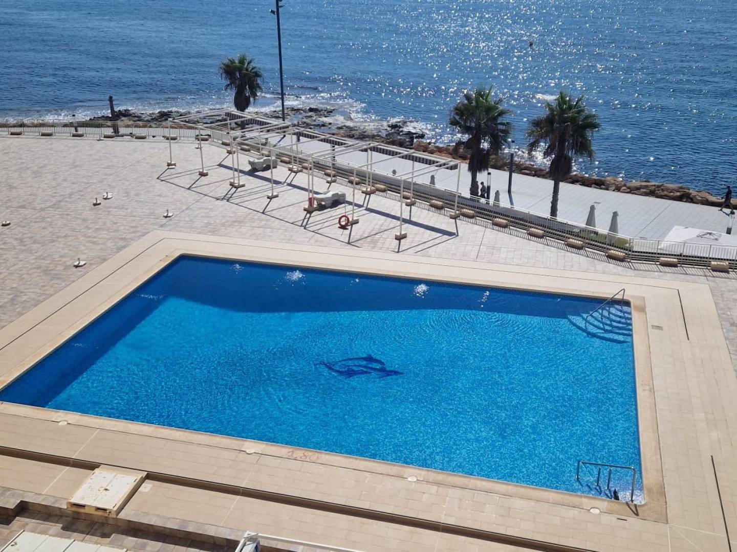 The apartment has 3 bedrooms and 2 bathrooms, ideal for families or groups who want space and comfort. The living-dining room is spacious and bright, with access to a large terrace that offers stunning views of the sea and the pool, creating an ideal environment to relax or enjoy meals outdoors.