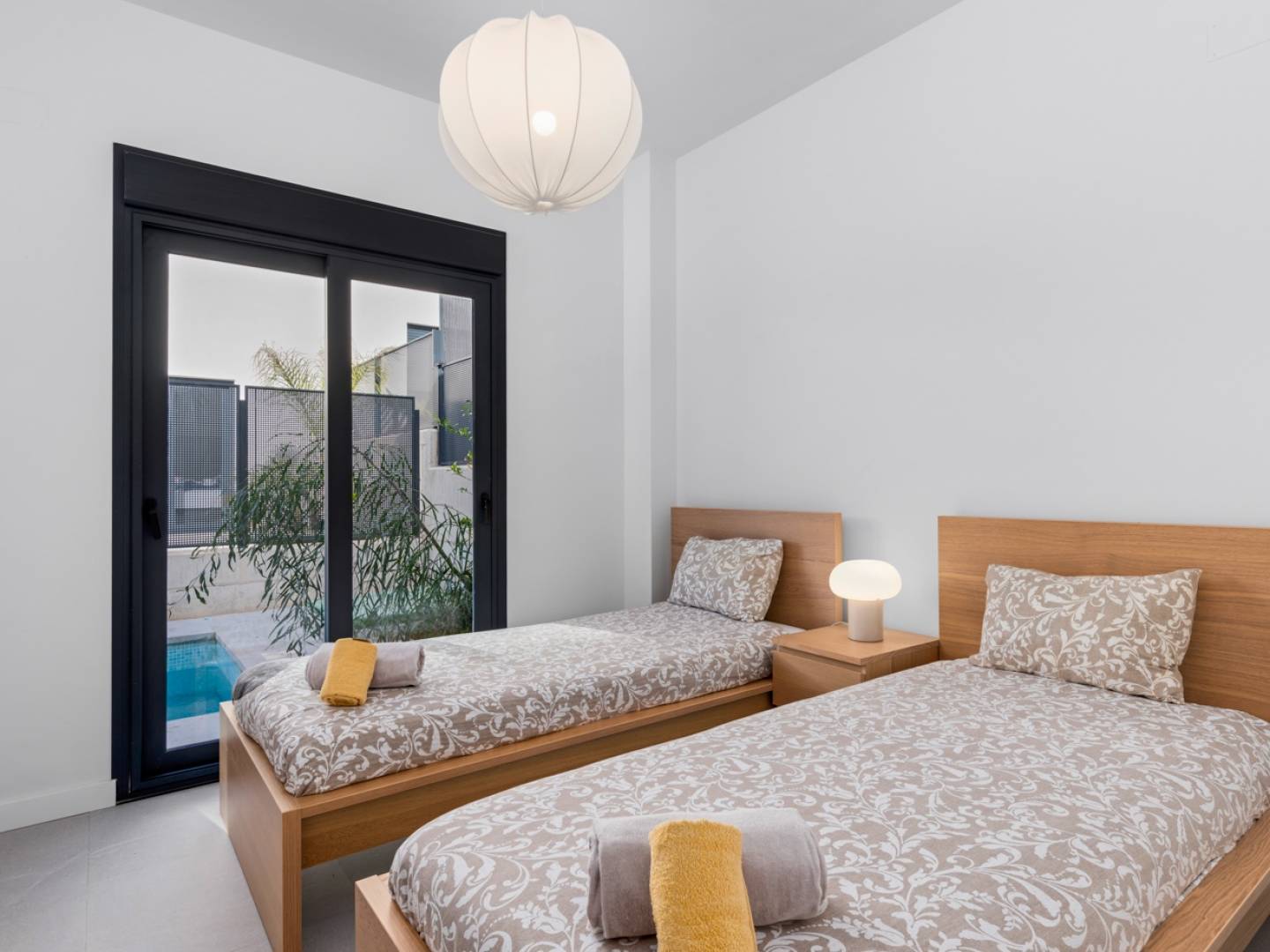 This 3-bedroom, 2-bathroom home, built in 2022, offers a functional layout and a range of practical features. With 125m² of living space on a 226m² plot, it is designed to provide comfort and convenience. The ground floor includes an open-plan living and dining area connected to a modern kitchen. Two bedrooms and a shared bathroom are located on this level. The outdoor space features a private pool, a garden, and a terrace suitable for outdoor dining or relaxation. On the upper floor, the master bedroom includes an en-suite bathroom and access to a spacious rooftop solarium. This area is well-suited for outdoor leisure or hosting guests. Additional features of the property include built-in wardrobes in all bedrooms, a laundry room, a storage area, and private parking on the plot. The home is equipped with air conditioning and is part of a gated community. The property is located in La Marina, San Fulgencio (Alicante), a quiet area close to essential services such as shops, restaurants, and medical facilities. The beaches of La Marina are approximately five minutes away by car, offering natural dunes and golden sand. Alicante Airport can be reached in about 25 minutes, making the location convenient for both residents and visitors.