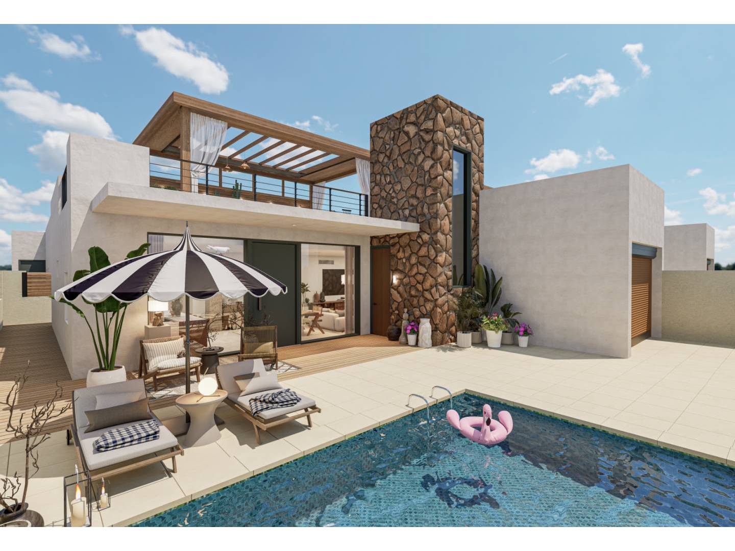 Each home includes a private pool, designed for total enjoyment with underwater night lighting and a saline chlorination system that guarantees more sustainable maintenance. The kitchen furniture is included, as well as the air conditioning system, ensuring immediate comfort from the first day.