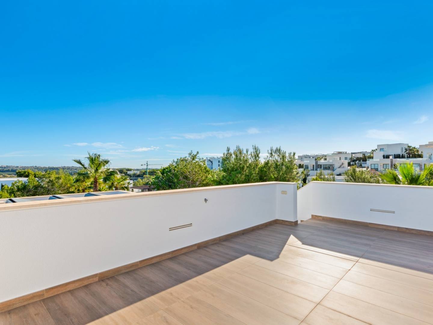 Nestled within the prestigious Las Colinas Golf & Country Club, one of the most exclusive golf resorts on the Costa Blanca, this breathtaking villa offers a unique blend of luxury, comfort, and nature. With its refined architecture and high-end finishes, this home provides everything you need for a carefree and stylish life under the Spanish sun. Upon entering, you are welcomed into a spacious and bright living area, where large windows offer stunning views of the surrounding landscape. The open-plan kitchen, fully equipped with modern built-in appliances, serves as the heart of the home and seamlessly flows into the elegant living room. Here, you can relax and enjoy cozy evenings in an atmosphere of pure sophistication. The villa features four generously sized bedrooms, including a master suite on the ground floor with its own en-suite bathroom, providing extra privacy and convenience. Additionally, there is a separate guest toilet on this level. On the lower floor, you will find three more spacious bedrooms, all with breathtaking views of the natural garden. Large windows allow natural light to flood the space, bringing the outdoors inside. This floor also houses two stylish bathrooms and a separate laundry room, combining practicality with modern elegance. The outdoor spaces are just as impressive as the interior. The beautifully landscaped garden offers a tranquil oasis where you can unwind, surrounded by the natural beauty of the resort. The heated private pool invites you for a refreshing dip at any time of the day, while the spacious terraces provide the perfect setting for long summer evenings of relaxation and entertainment. This villa is equipped with the latest technology, including an advanced home automation system, allowing you to effortlessly control lighting, temperature, and security. The Airzone climate system ensures perfect indoor comfort in every room, while the automatic shutters provide additional convenience and privacy. Additionally, solar panels contribute to an energy-efficient and sustainable living experience. For your convenience, the property offers private parking for two cars, ensuring a secure and comfortable place for your vehicles. Moreover, this exclusive villa comes fully furnished with luxury furniture worth €30,000 – everything is meticulously designed and ready for you to move in. Living in Las Colinas Golf & Country Club means embracing an exceptional lifestyle. This exclusive resort not only boasts an award-winning golf course but also offers a range of luxury amenities, including sports facilities, fine dining restaurants, and a secure residential environment. Furthermore, the stunning sandy beaches of the Costa Blanca are just a short drive away. Are you looking for a dream home where luxury, nature, and exclusivity come together? Then this villa in Las Colinas is the perfect choice. Contact us today for a viewing and experience this extraordinary living opportunity.