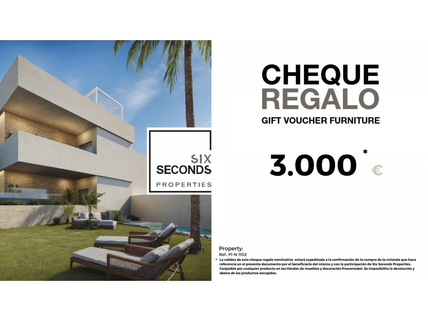 At Six Seconds Properties (965059685) we help you turn your new property into the house of your dreams, giving you a gift voucher worth € 3,000 worth of furniture and a technical visit to the property , where our technical team will advise you on the possibilities of improving the property. Totally free!!