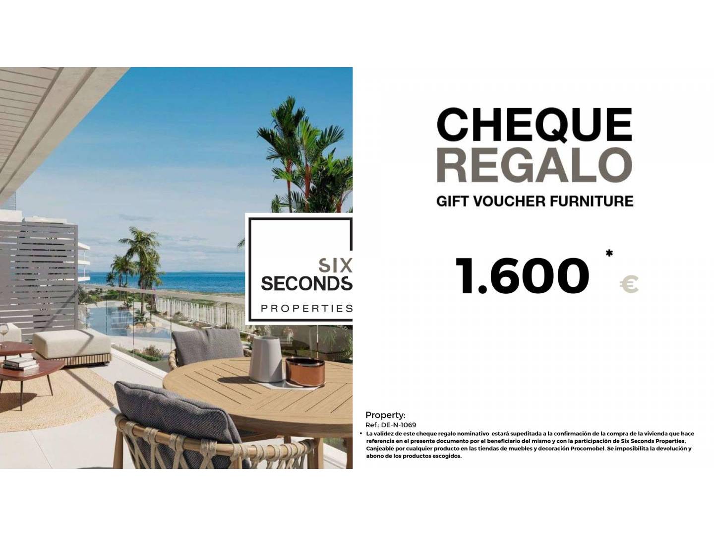 At Six Seconds Properties we help you turn your new property into the home of your dreams, giving you a gift voucher worth 1,600 euros for furniture and a technical visit to the property, where our technical team will advise you on the possibilities of improving the home . Totally free!!