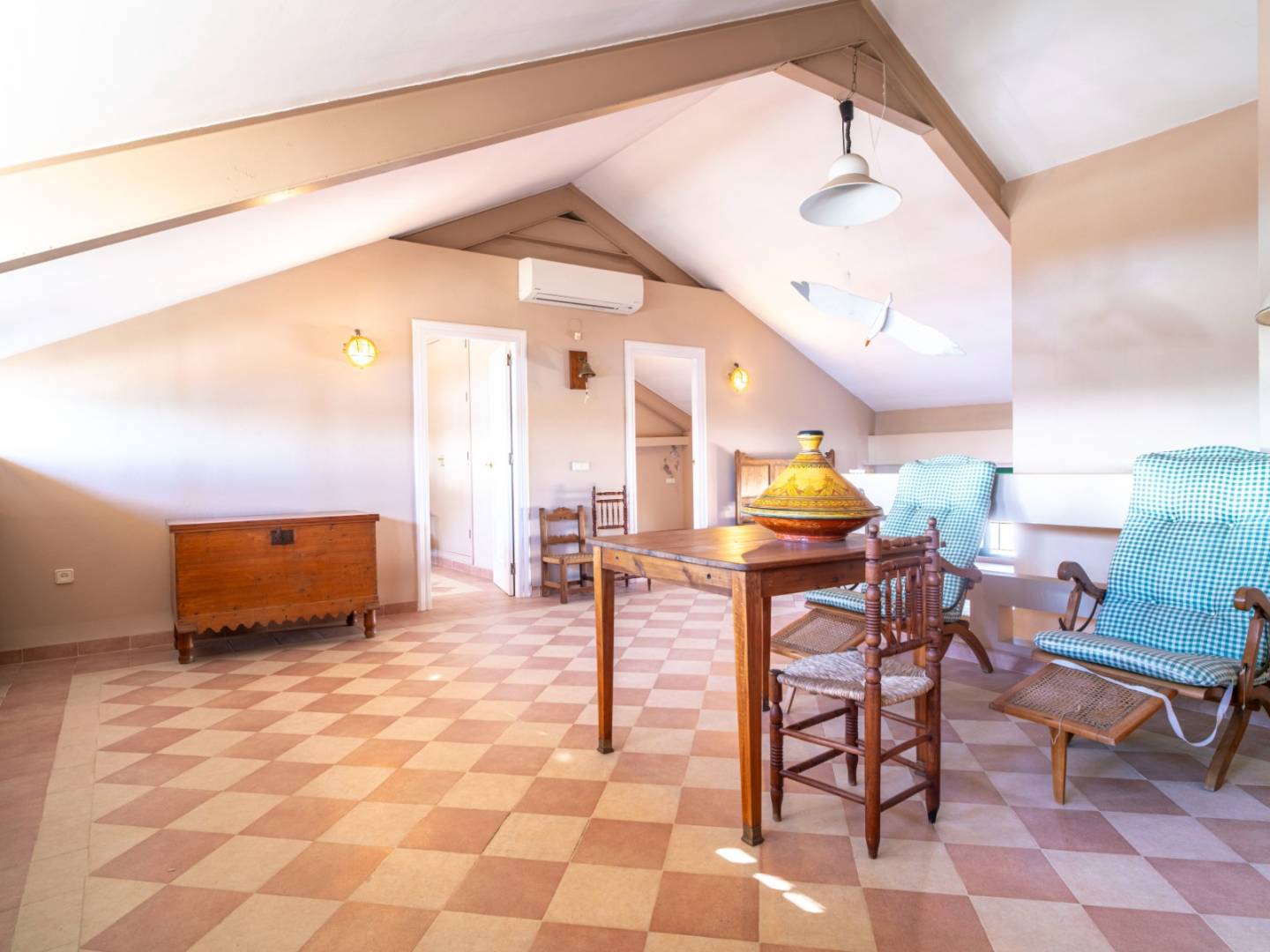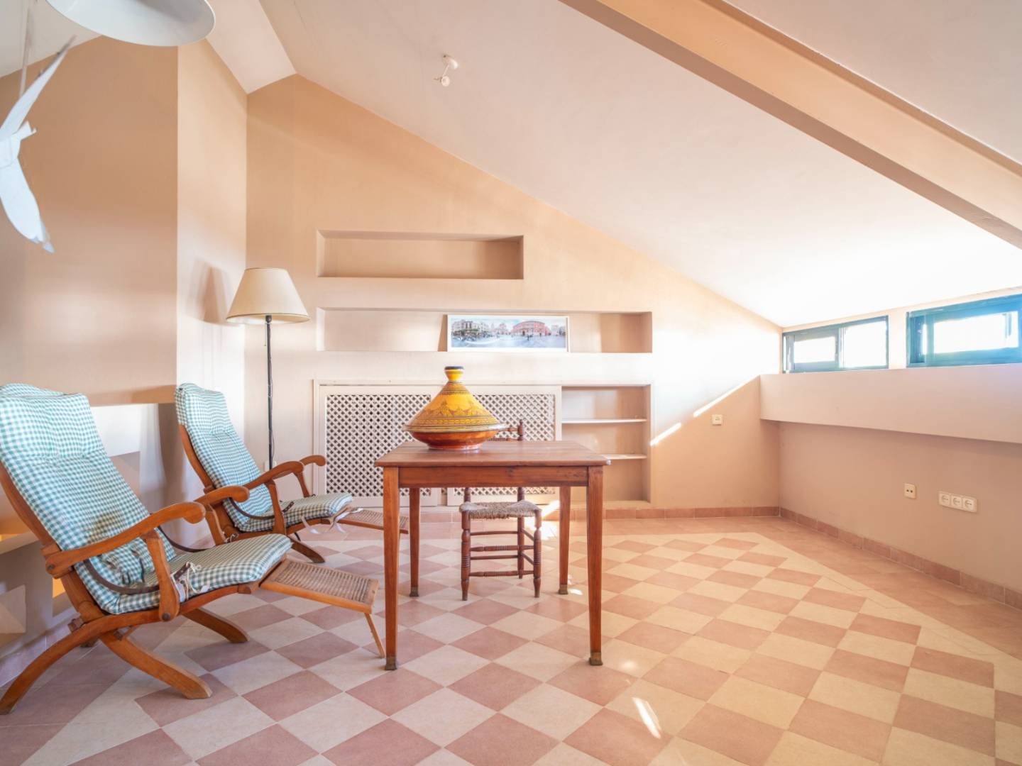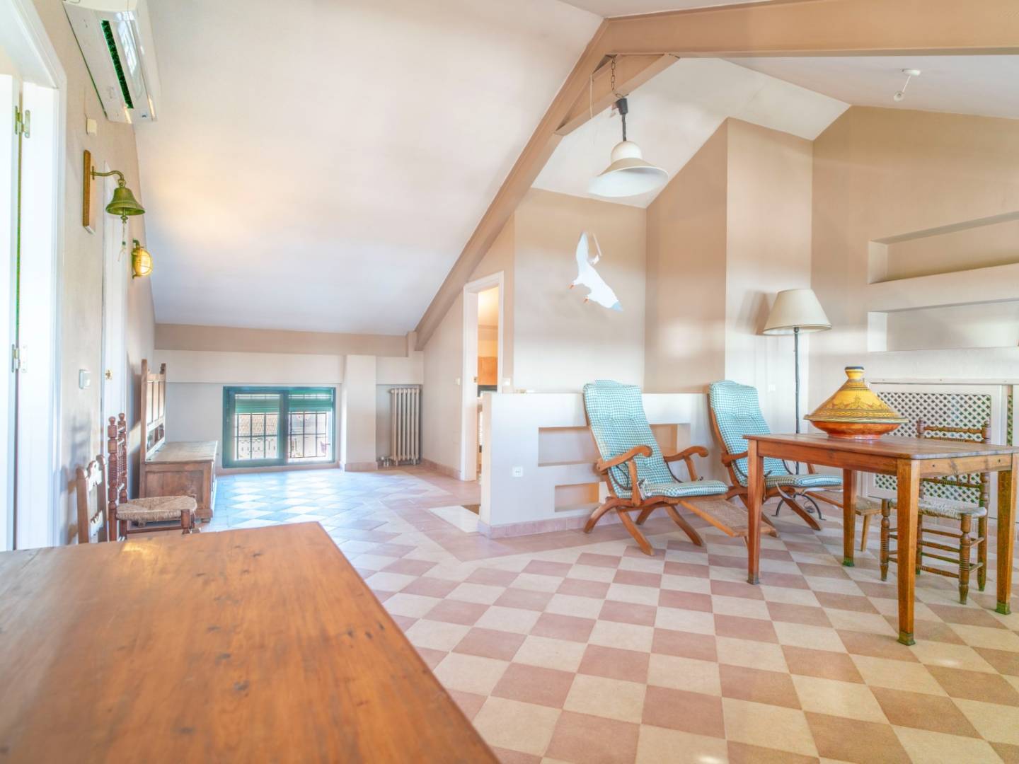 The living-dining room, with a fireplace and large windows, creates a welcoming and sophisticated atmosphere, flooded with natural light. Outside, the patio with private pool provides an intimate space to enjoy the sun all year round, while the spacious terraces offer different environments to relax, sunbathe or enjoy al fresco dining with panoramic views.