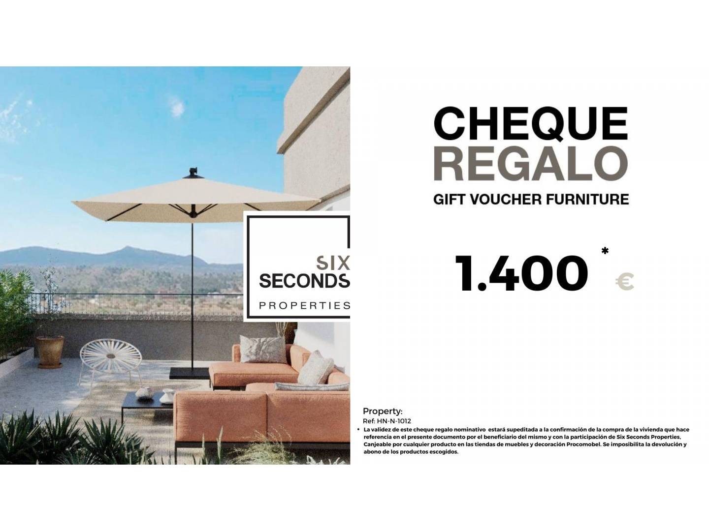 From our real estate agency, we can help you turn your new property into the home of your dreams by giving you a €1,400 furniture gift voucher and a technical visit from our design department to your home , where our technical team will advise you on improvements and decoration options for your property. Completely free!