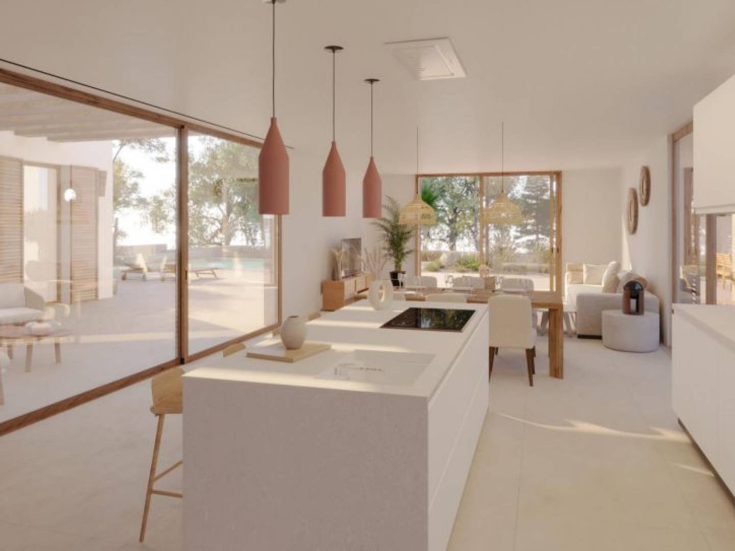 This beautiful brand new luxury villa in Moraira, in Ibizan style, is a real gem located in a very quiet area, within walking distance of the centre of Moraira and its beaches. With a distribution over two floors and beautiful sea views from it, it has 5 bedrooms and 5 bathrooms. Upon entering the property, you will be greeted by a spacious living room and a modern kitchen with breakfast bar and utility room, creating an open and bright space. The night area is separated on the ground floor, with 4 bedrooms and 3 bathrooms, all with high quality finishes. On the upper floor, 1 bedroom with en-suite bathroom, kitchen and living-dining room with the terrace offering wonderful sea views. The villa stands out for its excellent qualities both outdoors and indoors, with porcelain stoneware flooring from top national brands and a modern kitchen with marble countertops. The bathrooms have sanitary appliances of recognized brands. In addition, the villa is equipped with air conditioning by aerothermal system and underfloor heating or radiator throughout the house. A spacious terrace gives you sea views, next to a 55 m2 swimming pool and a well-equipped summer kitchen with barbecue, outdoor bathroom and covered seating area. In addition, it has a covered parking for two cars. Imagine enjoying the life of luxury and comfort in this spectacular villa in Moraira! Do not hesitate to contact us to visit it!