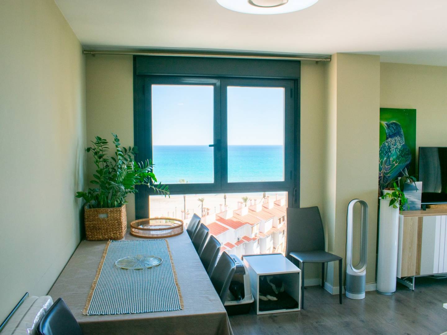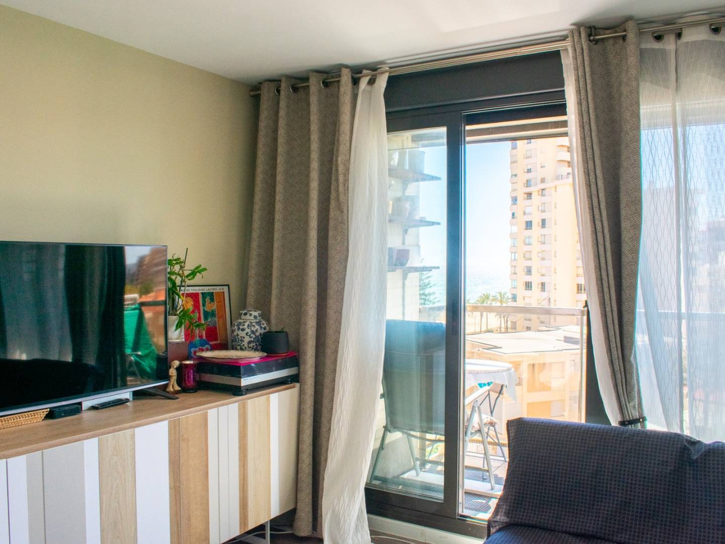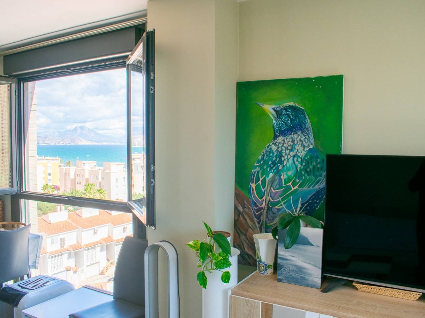It has a spacious living-dining room bathed in natural light , with access to a 4 m² balcony and a large window offering open views of the Mediterranean , ideal for relaxing or enjoying with guests.