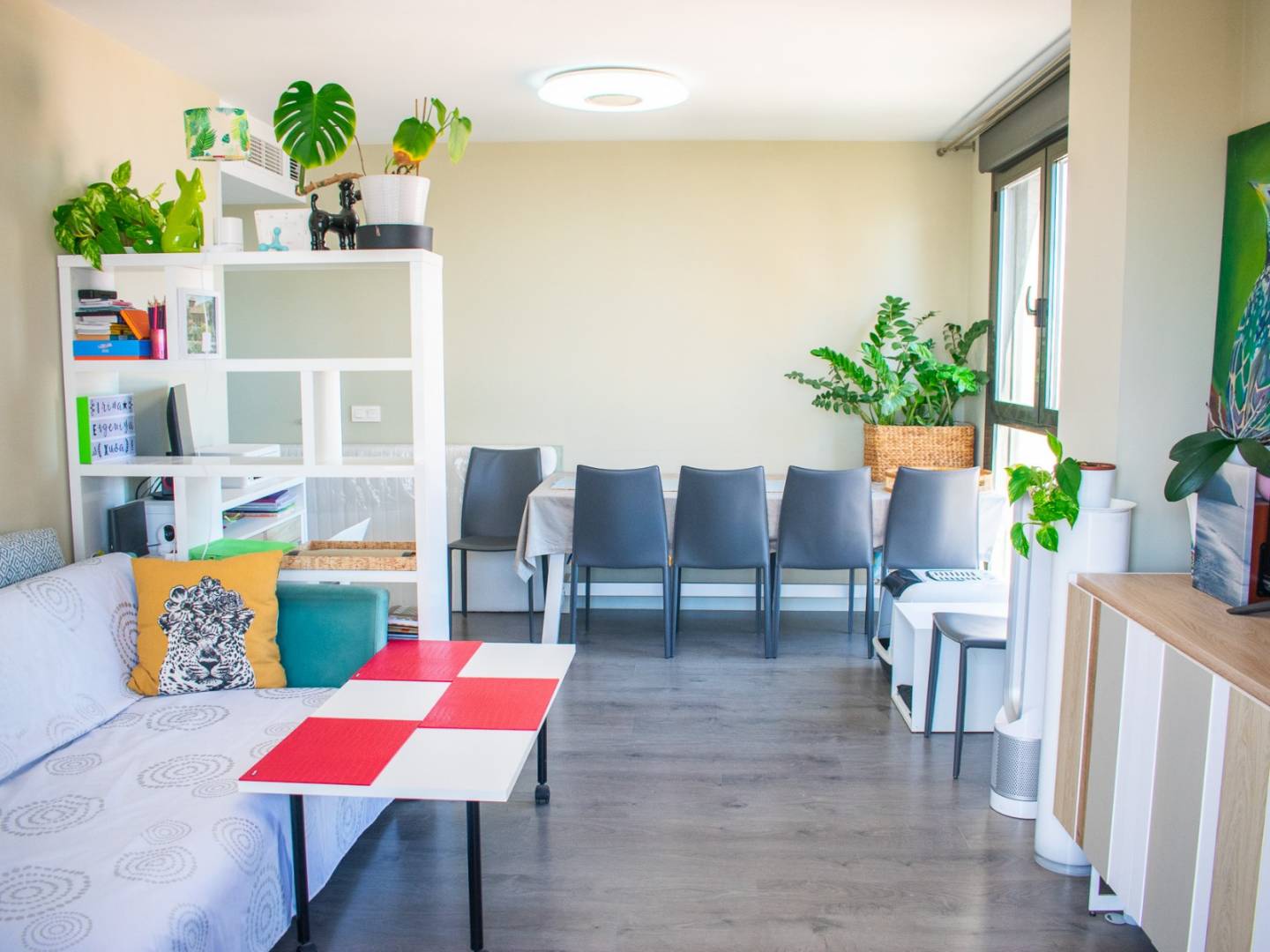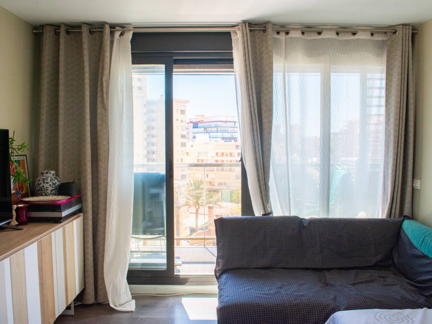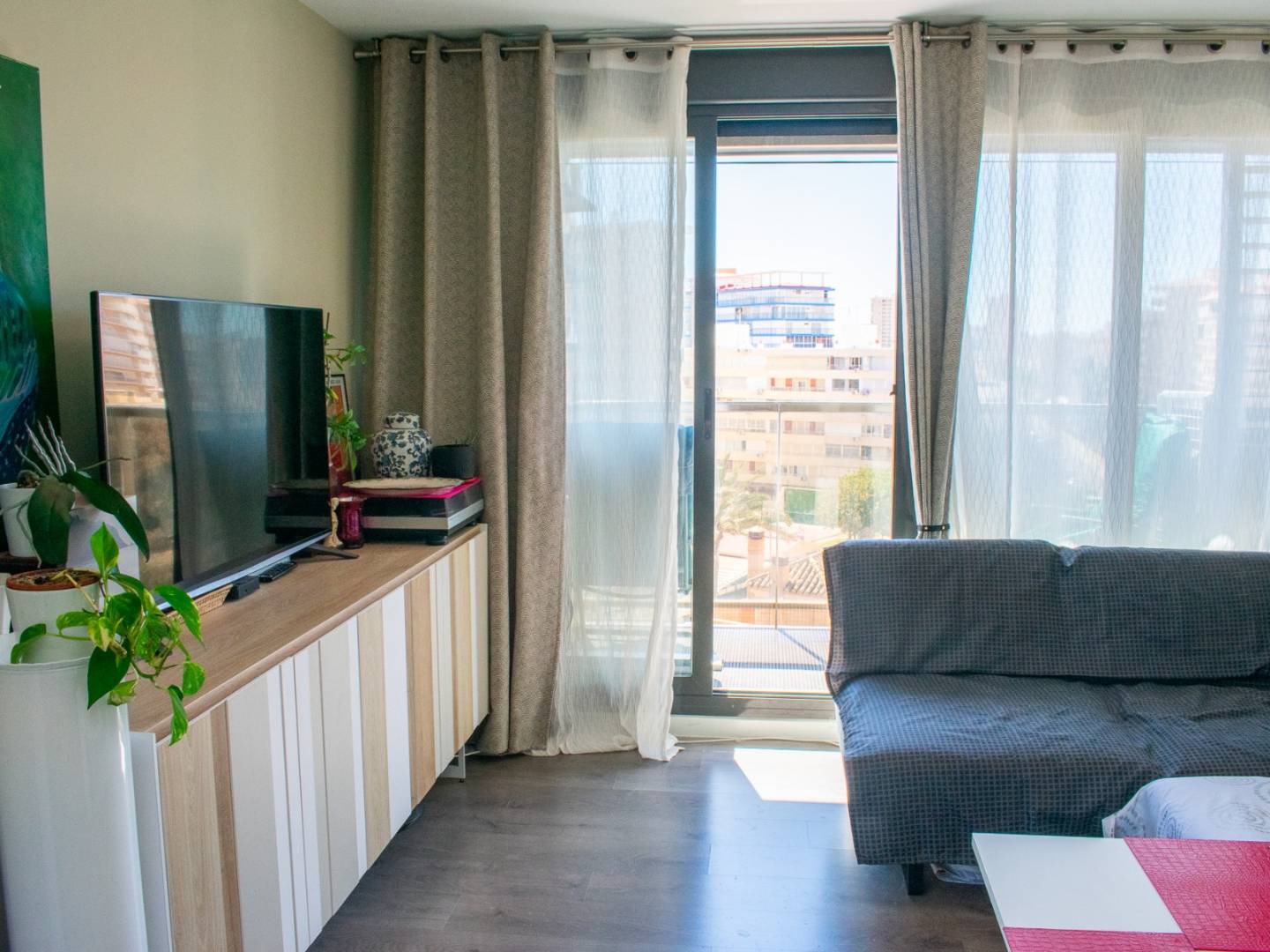 It has a spacious living-dining room bathed in natural light , with access to a 4 m² balcony and a large window offering open views of the Mediterranean , ideal for relaxing or enjoying with guests.