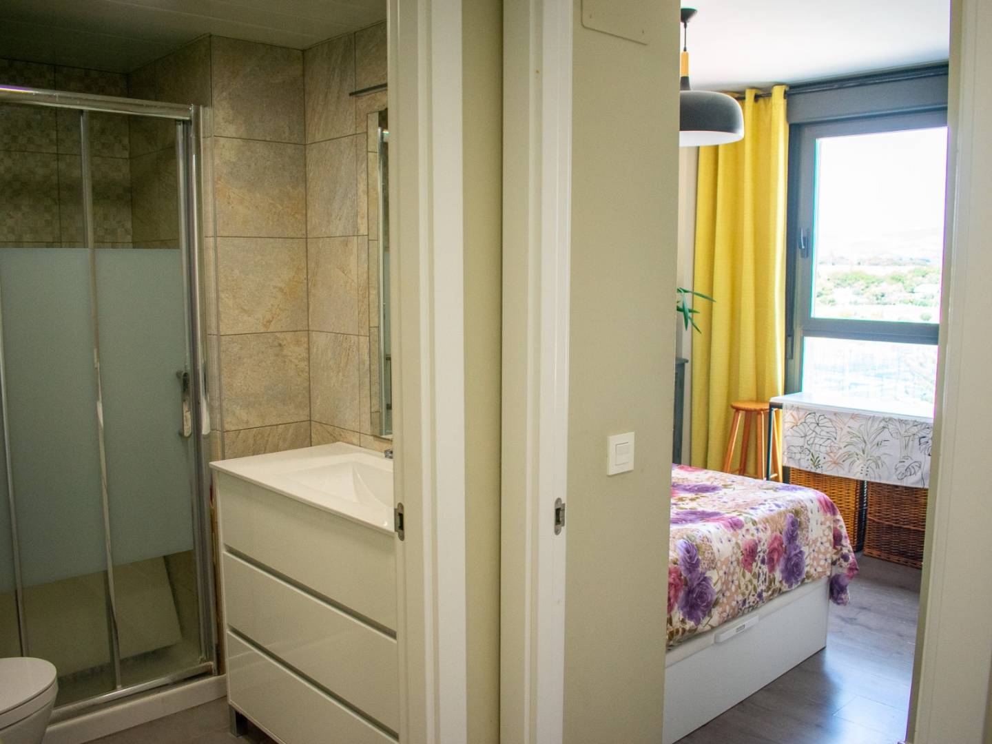 It also has a second full bathroom with a shower , decorated in a modern and functional style.
