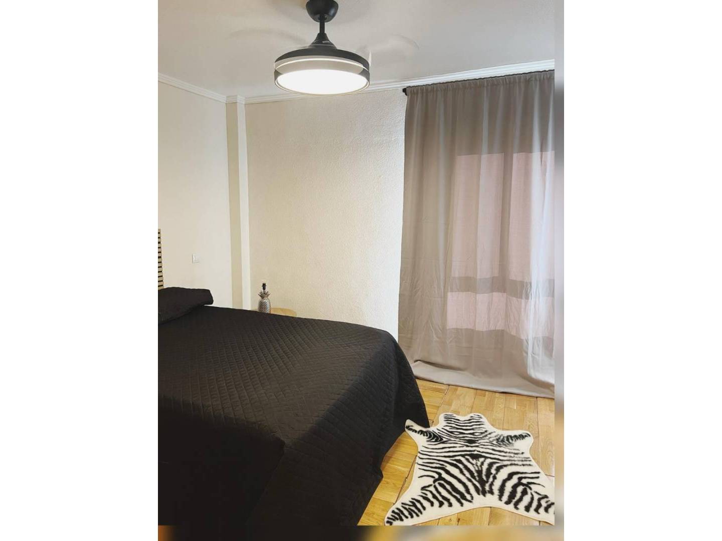 The property features three spacious bedrooms , a bright living room perfect for relaxing, a fully equipped independent kitchen , and a modern bathroom . The master bedroom has a large built-in wardrobe , while comfort is ensured by air conditioning in the living room and a remote-controlled fan in the master bedroom.