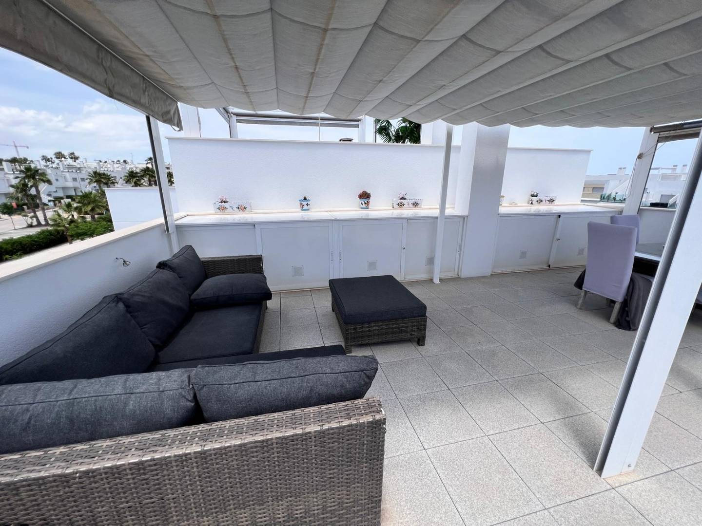 Located in one of the most sought after areas of the Costa Blanca, this bright first floor apartment offers comfort, style and a great location in the Vistabella Golf - Entre Naranjos residential complex. The property consists of two bedrooms with fitted wardrobes, two bathrooms and a modern, fully equipped open kitchen. The living/dining room opens onto a pleasant and spacious private terrace where you can enjoy the Mediterranean climate and the beautiful views of the communal gardens and swimming pool. The property also has a large private solarium, ideal for sunbathing, dining and relaxing. There is a solar-powered Jacuzzi on the solarium to relax at the end of the day. The house has air conditioning, anti-burglary door, intercom and is sold partly furnished. The property is located in a well maintained complex with access to a communal pool and green areas. Private parking included in the price. Just a 5 minute walk to bars, restaurants and supermarkets 5 minutes from Vistabella Golf Course 20 minutes drive from the beaches 40 minutes from Alicante airport Ideal as a holiday home, investment or permanent residence.