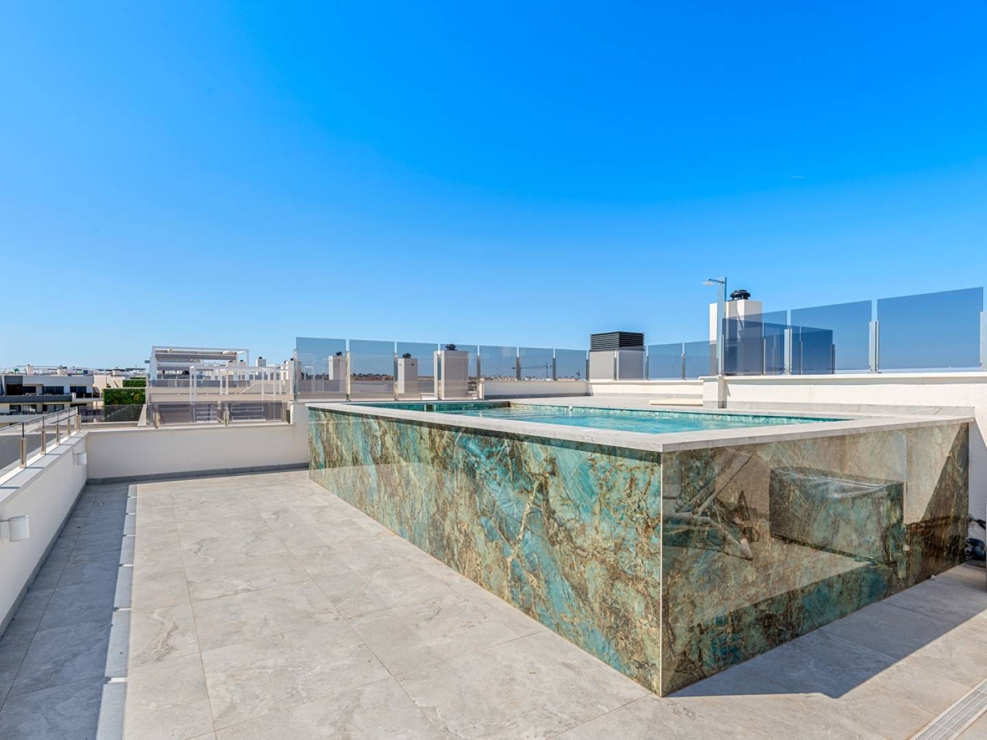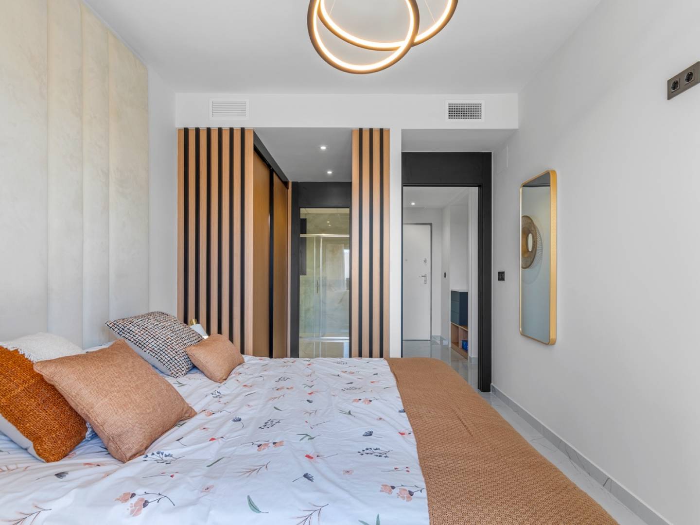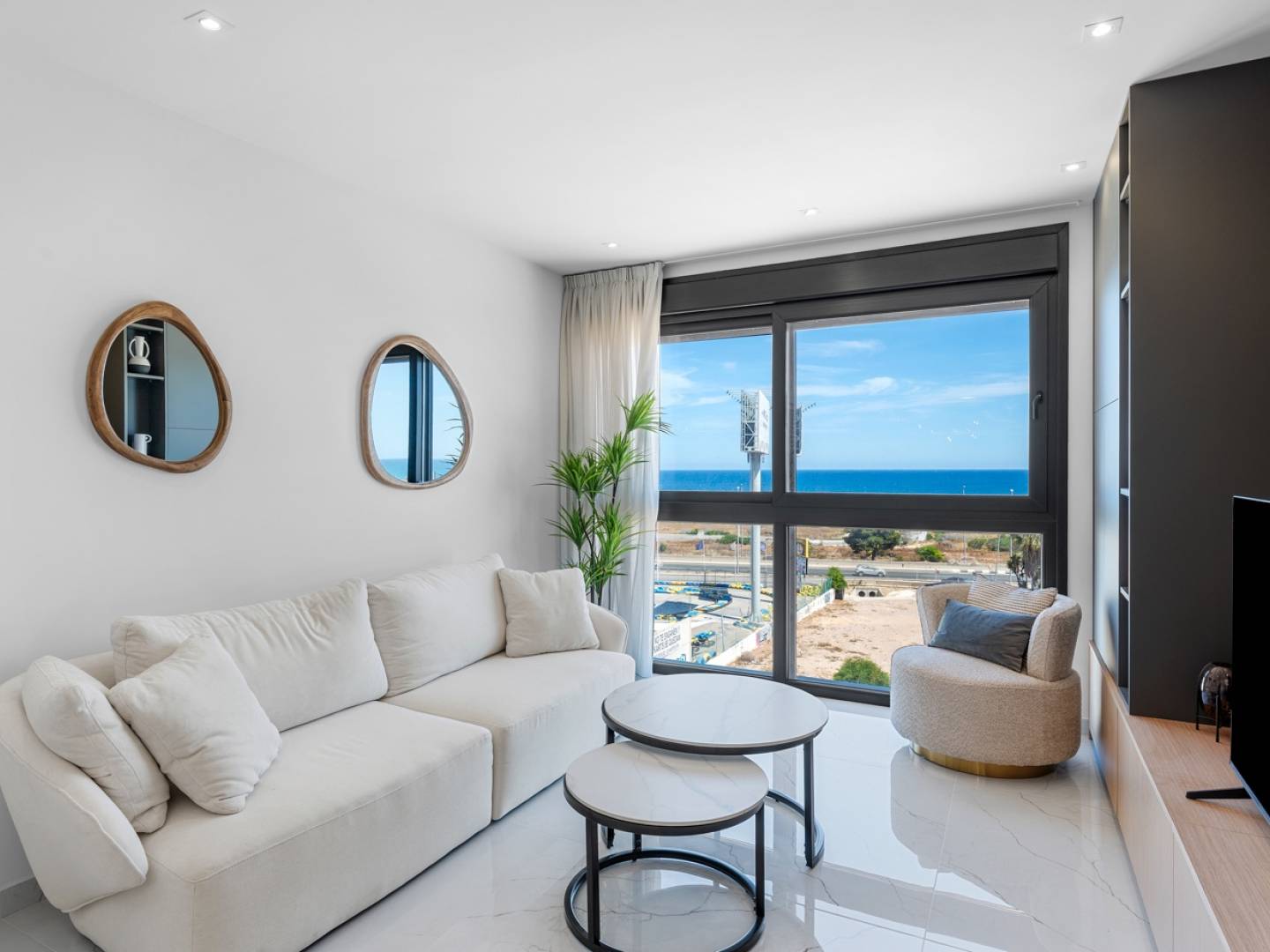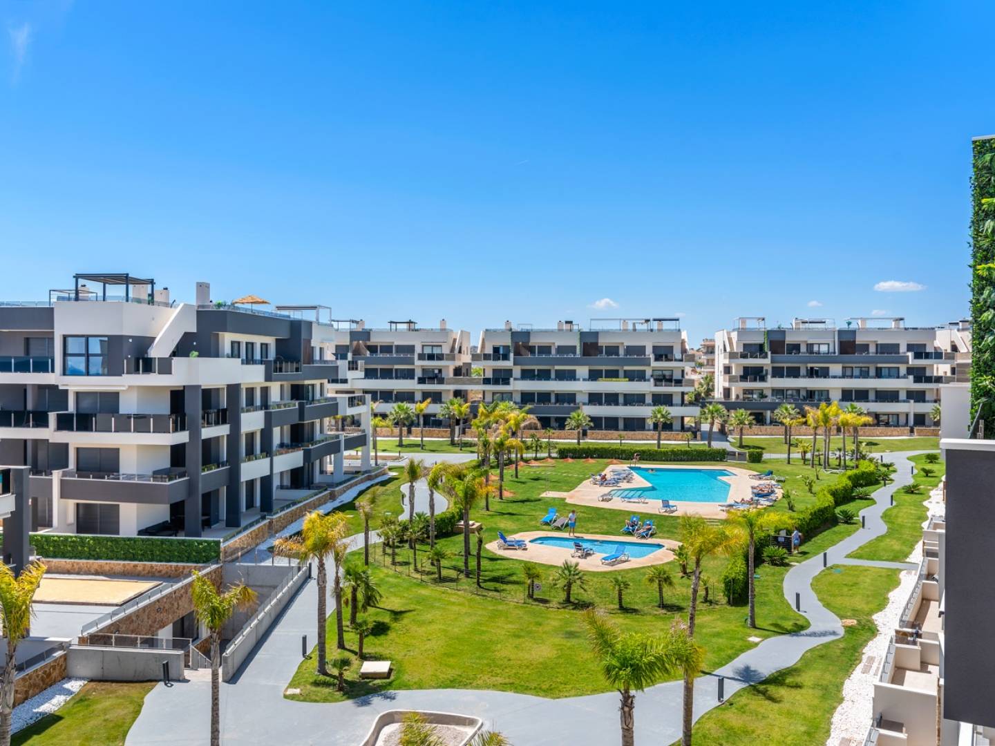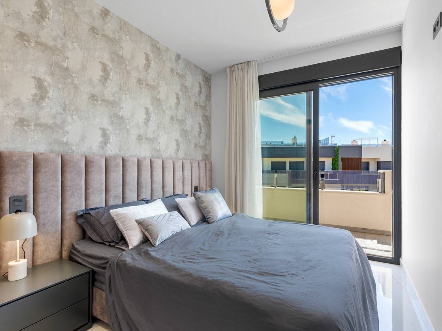 Located in the exclusive Amanecer Deluxe residential complex, this two-storey apartment offers an excellent combination of location, comfort and sea views. Situated in Orihuela Costa, just steps from the Mediterranean and close to all essential services, it is ideal as a permanent residence or holiday investment. The property features three bedrooms, two bathrooms (one en suite), an independent kitchen, and a spacious living-dining area. All rooms, including the kitchen, have direct access to a continuous balcony with sea views and space to sit and enjoy the outdoors. It is sold fully furnished and equipped with high-quality materials: PVC windows with electric shutters, underfloor heating in bathrooms, and modern finishes. On the upper floor, you'll find a private solarium with a swimming pool, perfect for relaxing in complete privacy. The apartment also includes a large, enclosed parking space within the complex. The residential offers communal green areas, a swimming pool and a children's playground, all in a quiet and well-maintained setting.