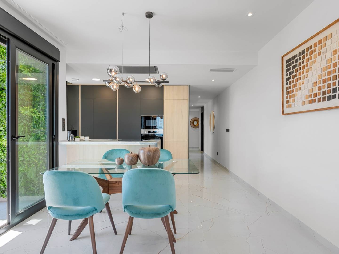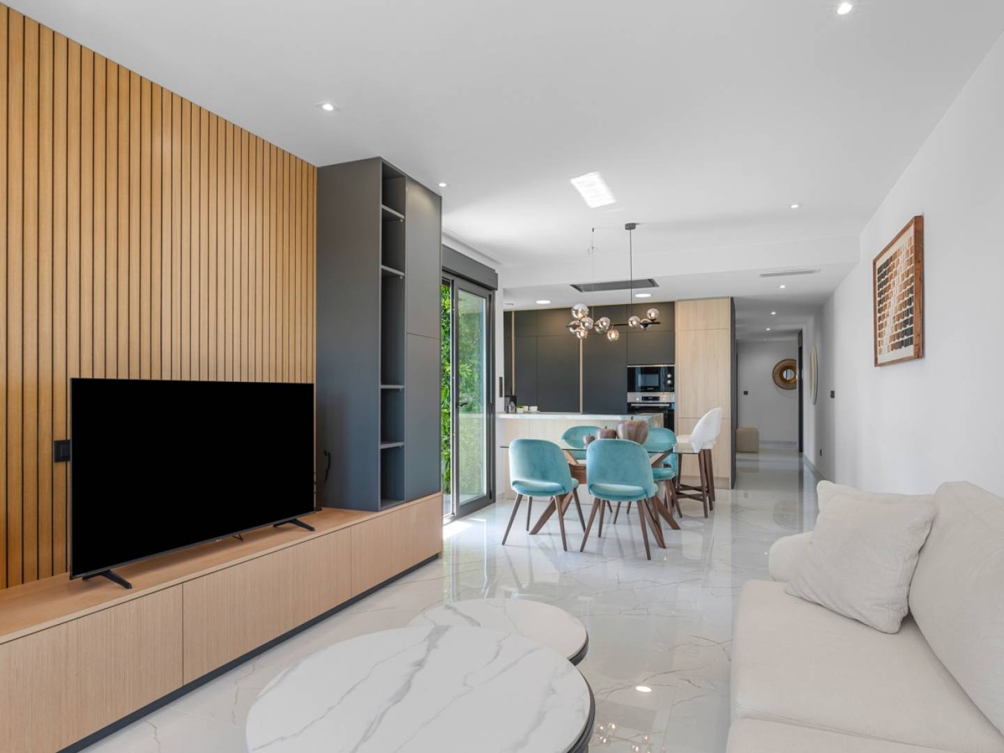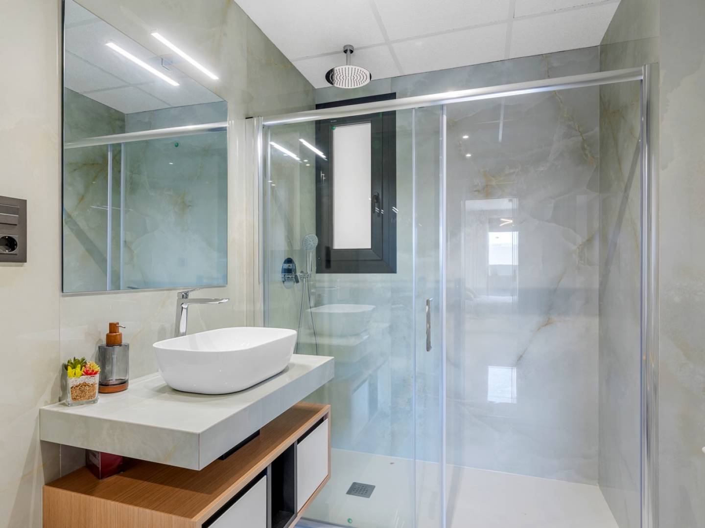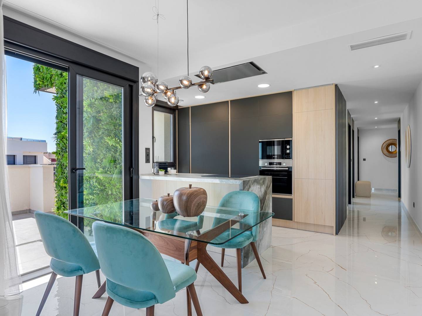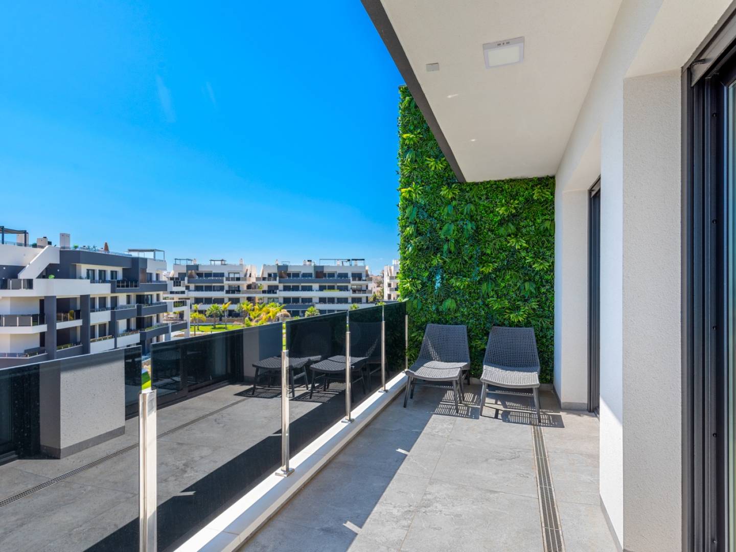 Located in the exclusive Amanecer Deluxe residential complex, this two-storey apartment offers an excellent combination of location, comfort and sea views. Situated in Orihuela Costa, just steps from the Mediterranean and close to all essential services, it is ideal as a permanent residence or holiday investment. The property features three bedrooms, two bathrooms (one en suite), an independent kitchen, and a spacious living-dining area. All rooms, including the kitchen, have direct access to a continuous balcony with sea views and space to sit and enjoy the outdoors. It is sold fully furnished and equipped with high-quality materials: PVC windows with electric shutters, underfloor heating in bathrooms, and modern finishes. On the upper floor, you'll find a private solarium with a swimming pool, perfect for relaxing in complete privacy. The apartment also includes a large, enclosed parking space within the complex. The residential offers communal green areas, a swimming pool and a children's playground, all in a quiet and well-maintained setting.
