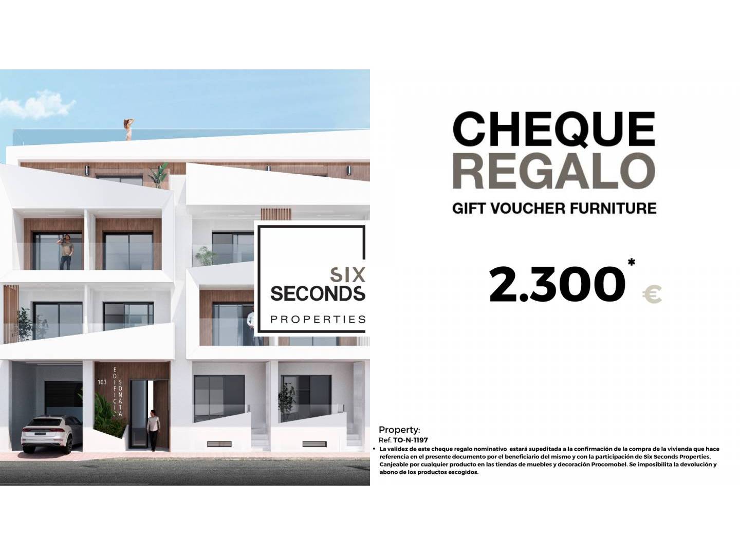 At Six Seconds Properties (965059685), we'll help you turn your new property into the home of your dreams by giving you a €2,300 gift voucher for furniture and a technical visit to the home, where our technical team will advise you on home improvement options. Completely free!