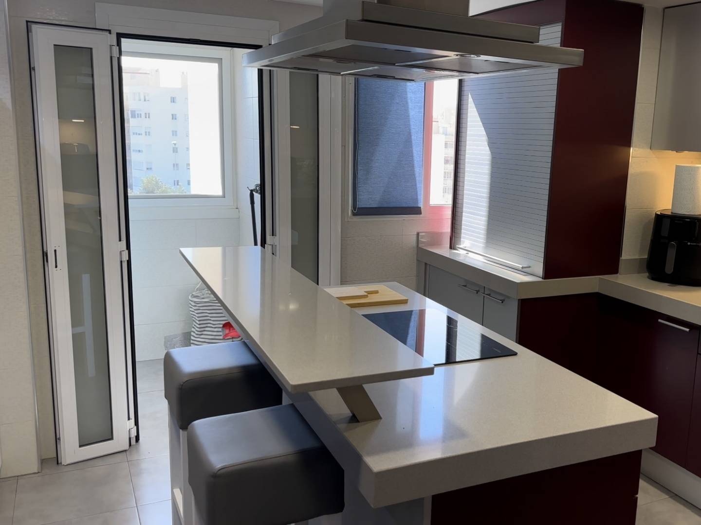 On the main floor, you'll find a spacious living room with a dining area , flooded with natural light and offering unobstructed sea views , next to a fully equipped independent kitchen with new appliances and also overlooking the port . A full bathroom completes this social floor.