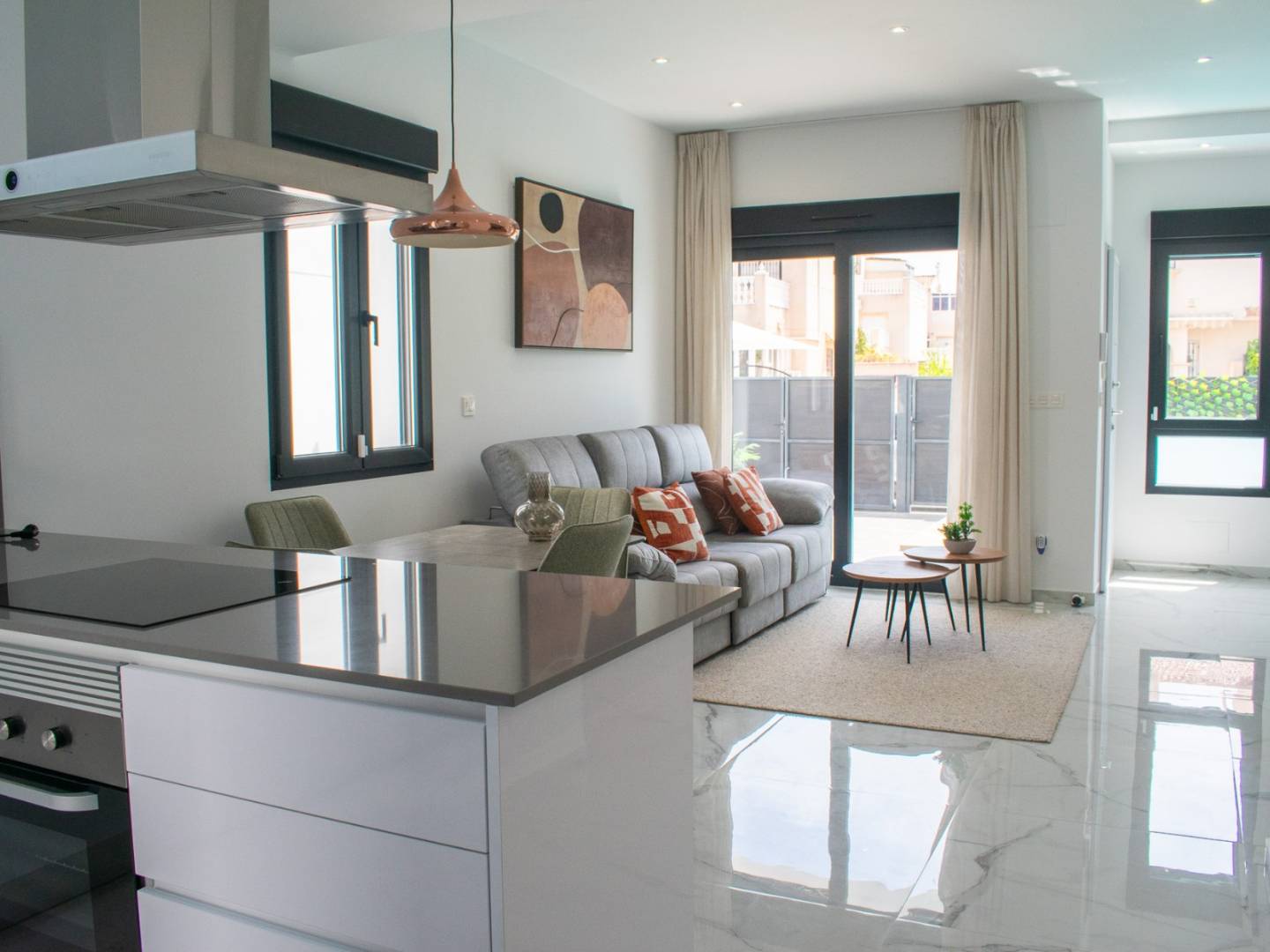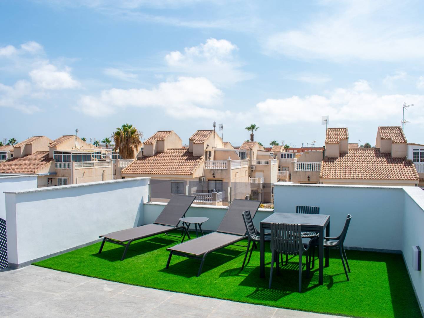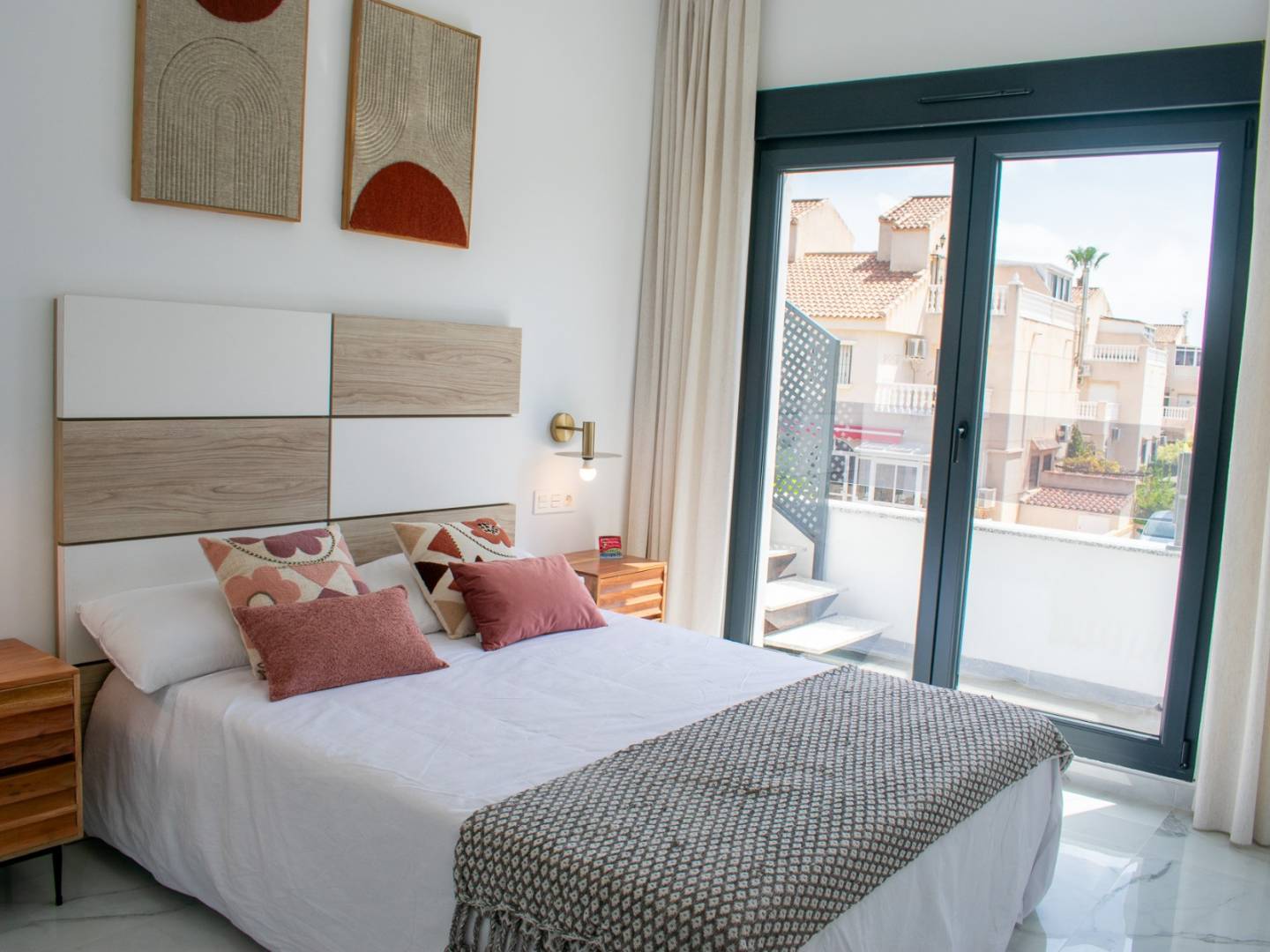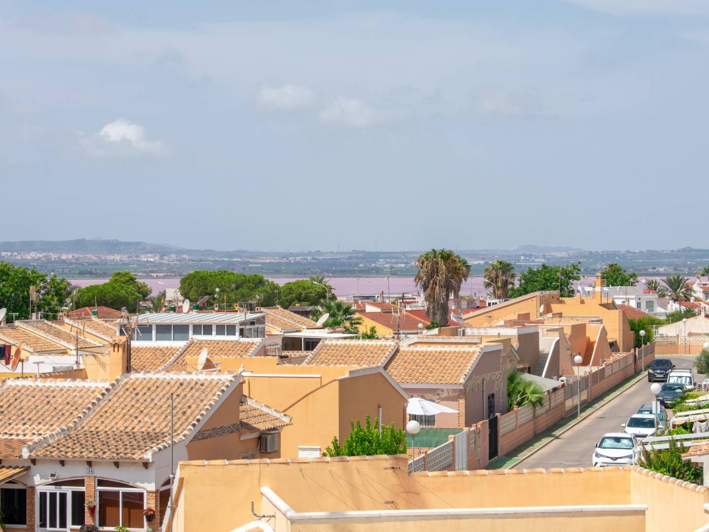 With a plot of 116 m² and 106 m² built area , the property is spread over two floors. On the ground floor, a bright living-dining room with an open kitchen , a double bedroom , and a full bathroom allow for comfortable living on one level. Upstairs, there are two spacious bedrooms with en-suite bathrooms and direct access to a private solarium with stunning views of Torrevieja's Pink Lagoon .