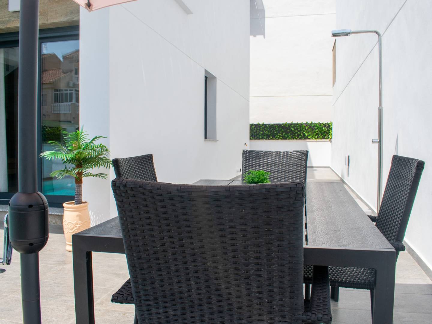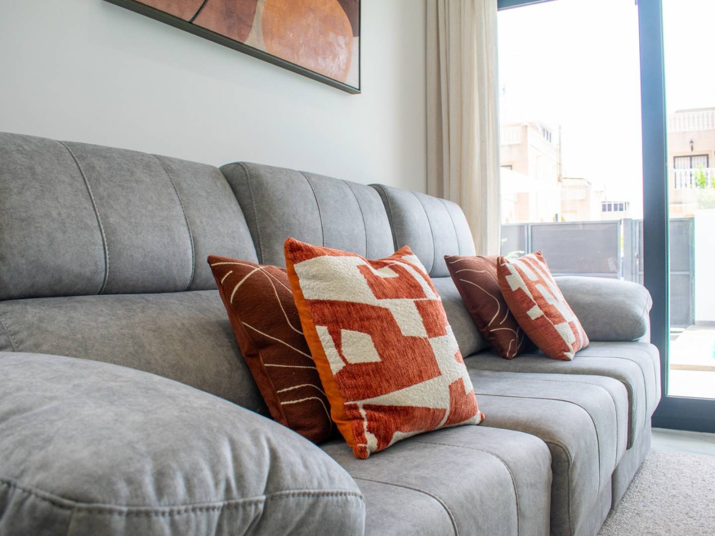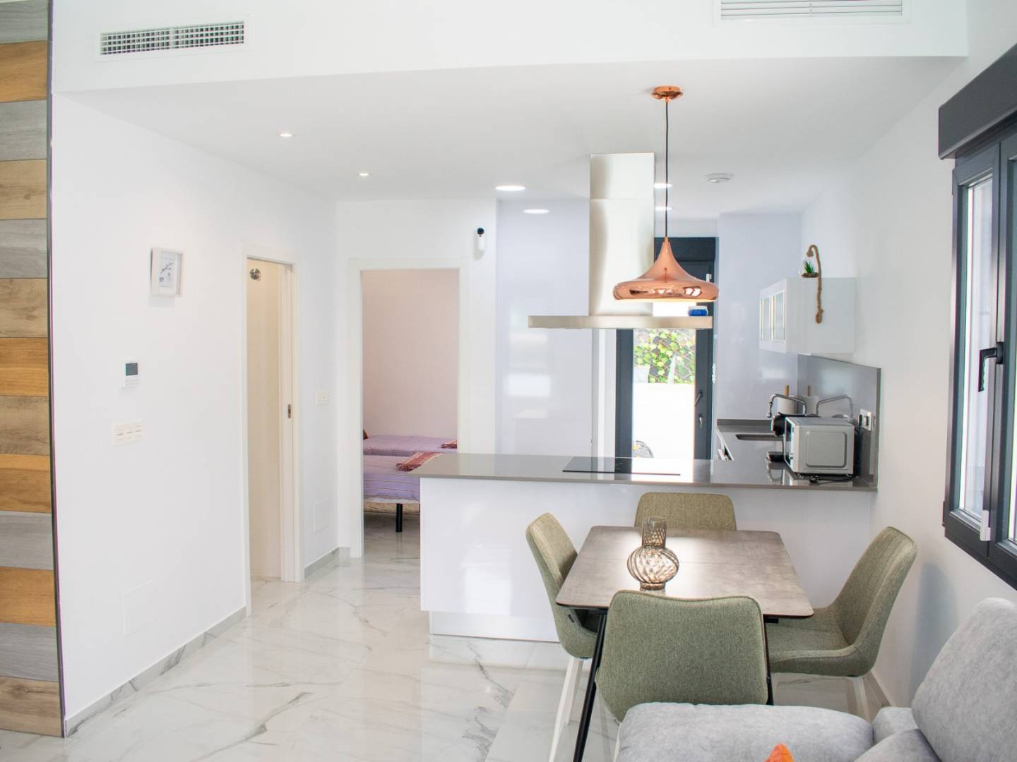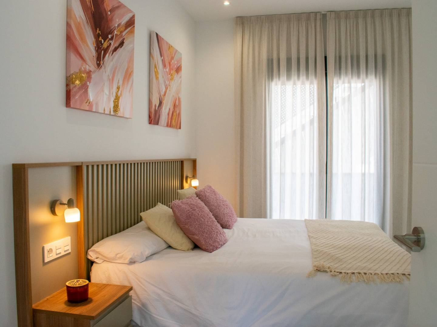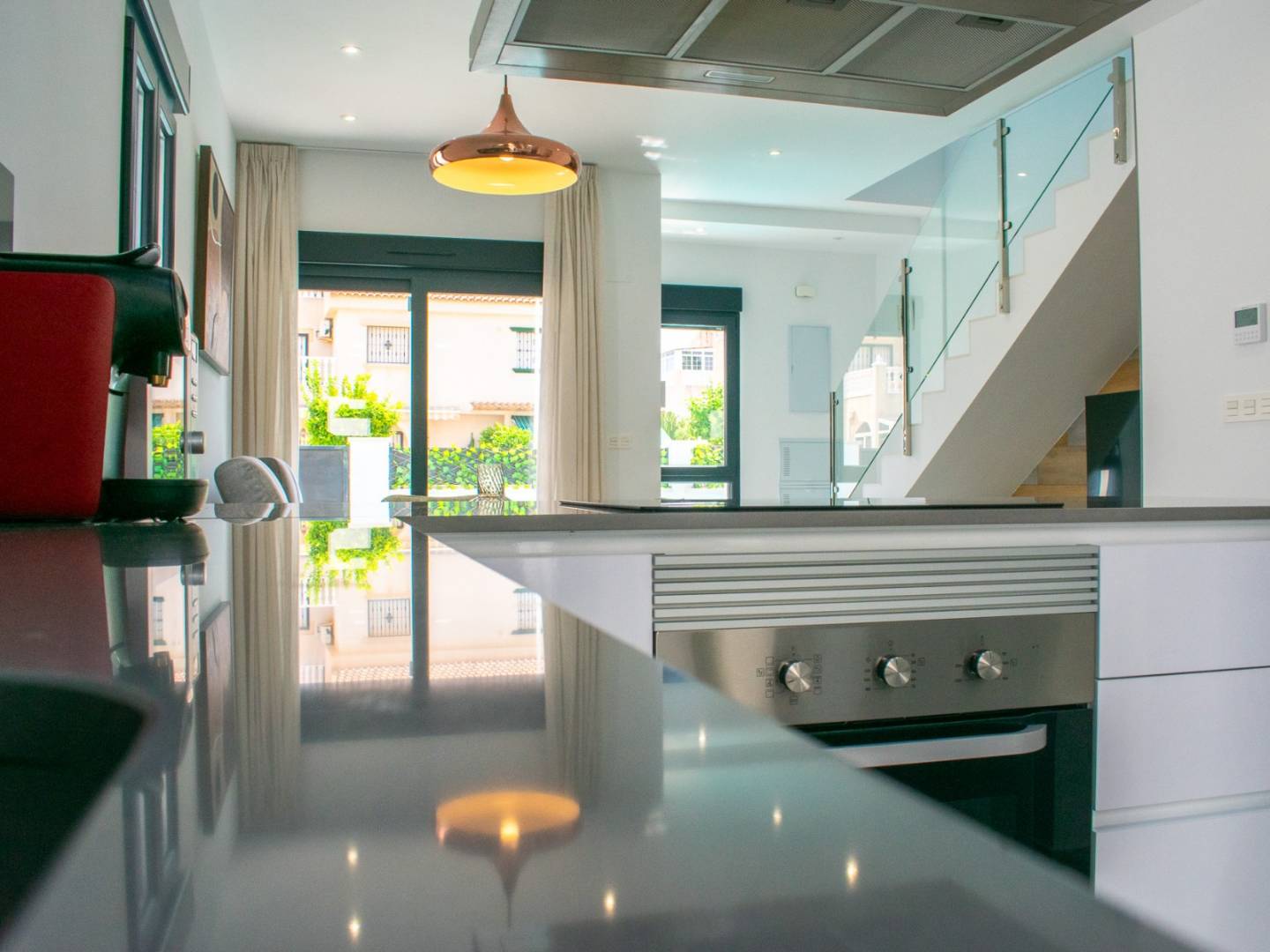 With a plot of 116 m² and 106 m² built area , the property is spread over two floors. On the ground floor, a bright living-dining room with an open kitchen , a double bedroom , and a full bathroom allow for comfortable living on one level. Upstairs, there are two spacious bedrooms with en-suite bathrooms and direct access to a private solarium with stunning views of Torrevieja's Pink Lagoon .