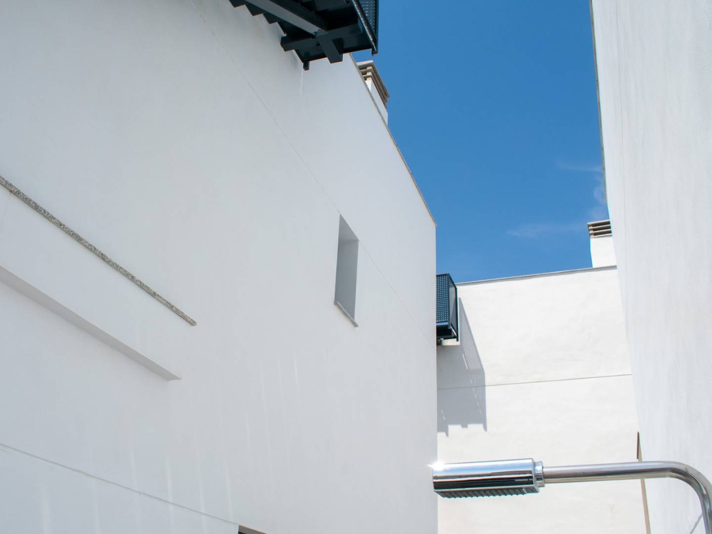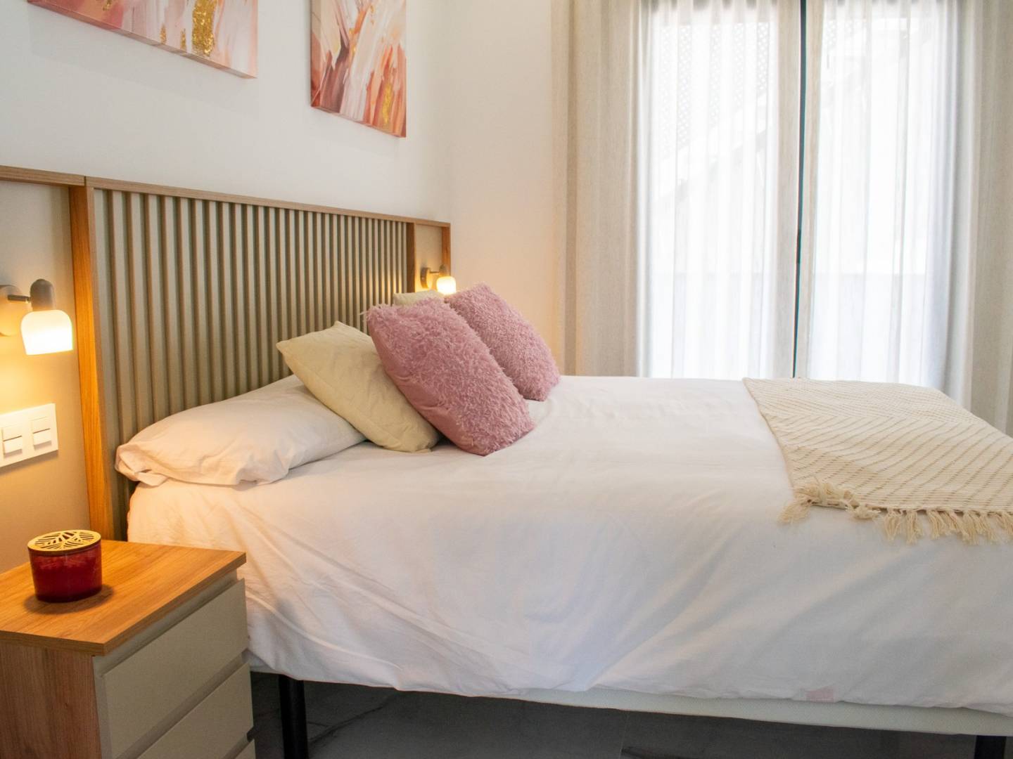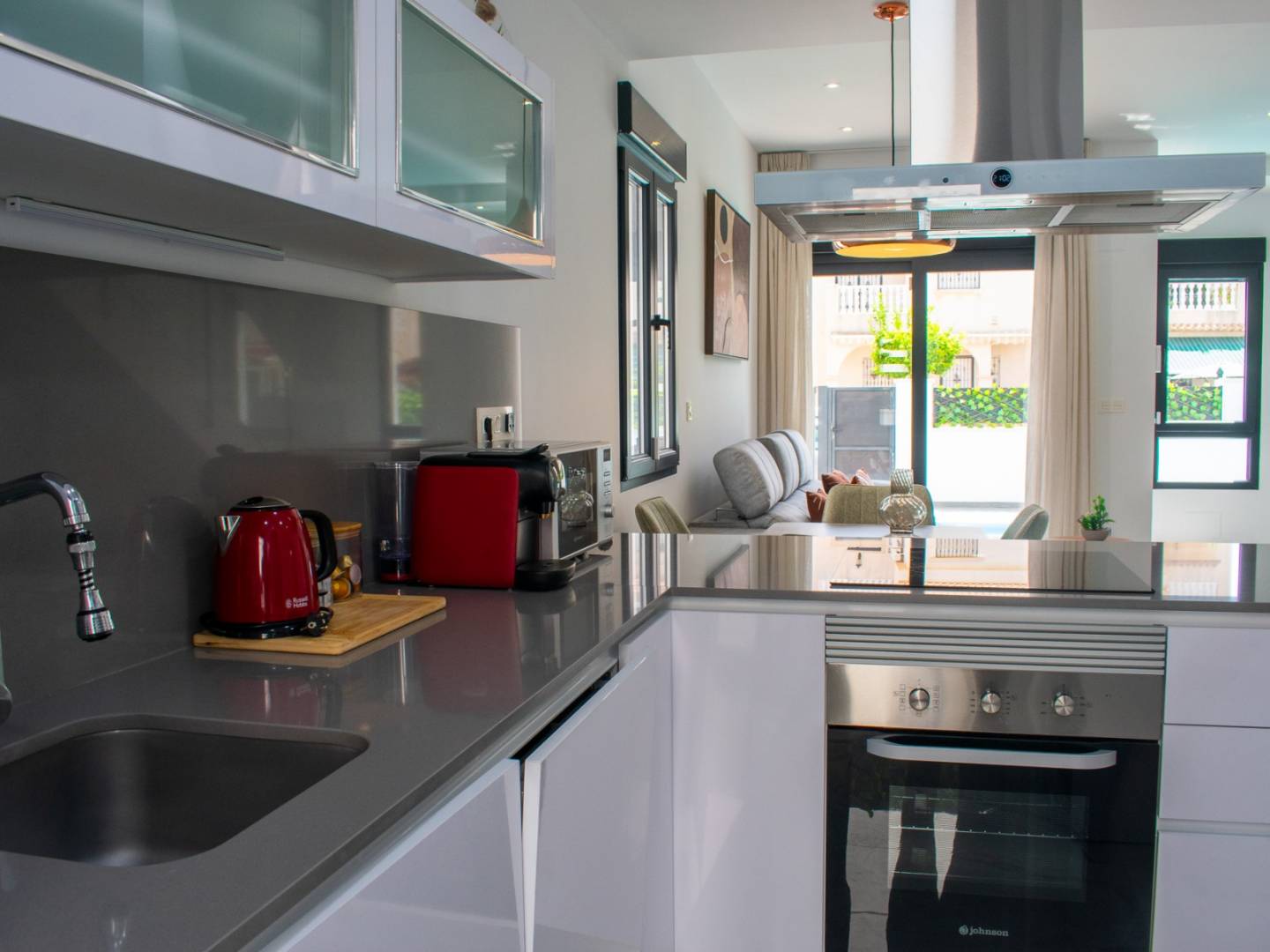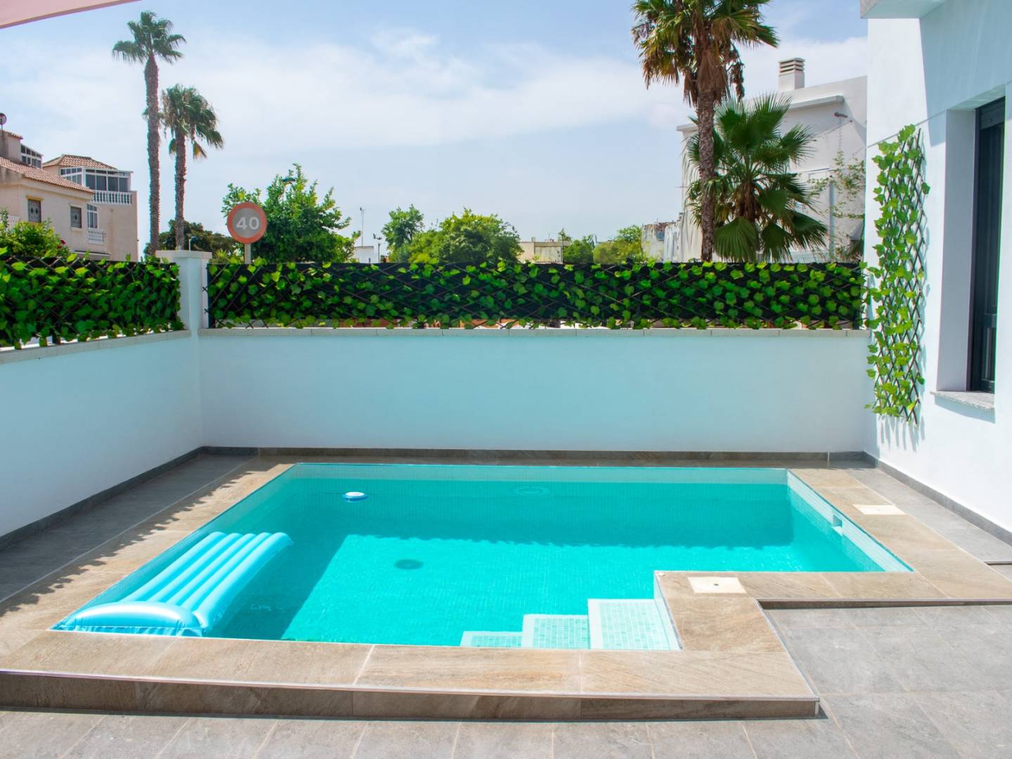 With a plot of 116 m² and 106 m² built area , the property is spread over two floors. On the ground floor, a bright living-dining room with an open kitchen , a double bedroom , and a full bathroom allow for comfortable living on one level. Upstairs, there are two spacious bedrooms with en-suite bathrooms and direct access to a private solarium with stunning views of Torrevieja's Pink Lagoon .