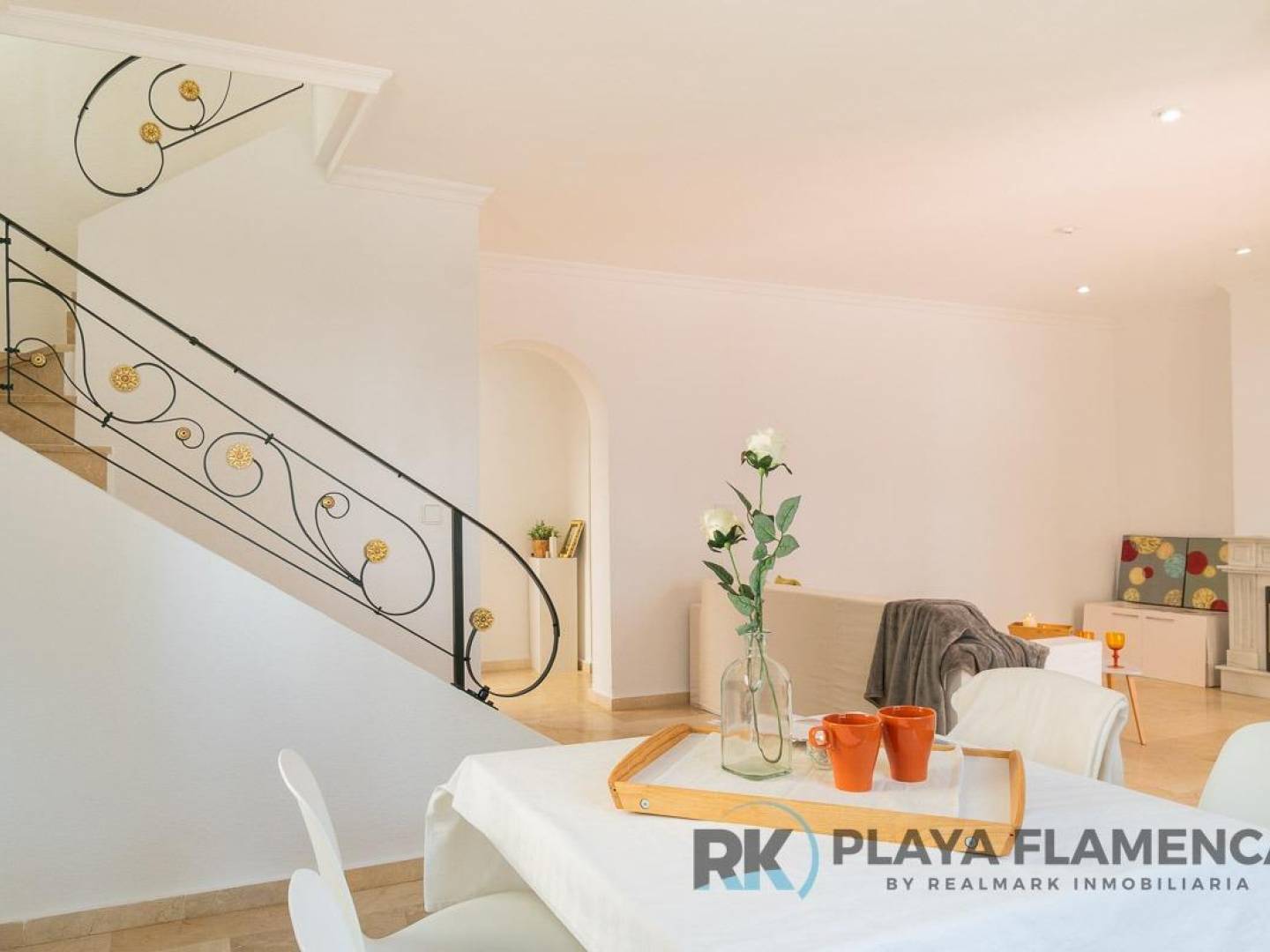 In one of the quietest and most exclusive areas of the VillaMartin development, very close to three golf courses and with its own garden and pool, lies this beautiful villa overlooking green areas, perfect for a large family.~The property is located near three golf courses: Las Ramblas, Campoamor, and Villamartín. It also has easy access to the AP-7 motorway exit, with direct connections to the airports of Alicante (approx. 40 km) and Murcia (approx. 40 km).~It features a communal pool with gardens, where you can enjoy sunbathing and swimming with the rest of the neighbors. It also has its own garden and tiled terraces, and a pool in need of renovation.~The villa's size is ideal for those looking for space, or for entertaining guests and friends; with its 3 bedrooms, 2 bathrooms, and a good-sized plot and garden area.~The 410-square-meter plot is perfect for having space and a sense of independence, with its paved front garden with a vehicle entrance and a paved rear garden with unobstructed views. However, since it's paved and doesn't have many trees and plants, it doesn't require much maintenance or work. The villa faces south on its main facade, terraces, and solarium, so it has sun practically all day. This villa is undoubtedly the dream of many.~And the layout of the home: accessed from the garden, as mentioned, is the first terrace, facing south-southwest. It has sun all day long, but at the same time, being open to the garden and the street, it lets in a full breeze. This spacious terrace, with room for sofas and tables, leads to the main entrance of the home with a security door, which opens onto the spacious and bright living and dining area with a fireplace. It also has a separate kitchen with its own door and window, allowing you to cook without having to worry about odors and grease entering the rest of the home.~Also on the ground floor is a spacious bedroom with a built-in wardrobe and a bathroom with a walk-in shower. This means that if the family has an elderly person or someone with mobility issues, they can live on this floor alone without having to go up and down stairs.~The first floor, accessible via the two-flight interior staircase with easy access, leads to the other two bedrooms with built-in wardrobes and direct access to the large solarium and balcony. This floor also features a second bathroom, this time with a bathtub for relaxing soaks and built-in furniture.~This means that each floor has its own bathroom, bedrooms, and space to enjoy both the outdoors and indoors, with terraces, making it the perfect home for a large family.~~The home is worth a visit for its spaciousness, its light, its proximity to all amenities and the golf course, and its tranquility.