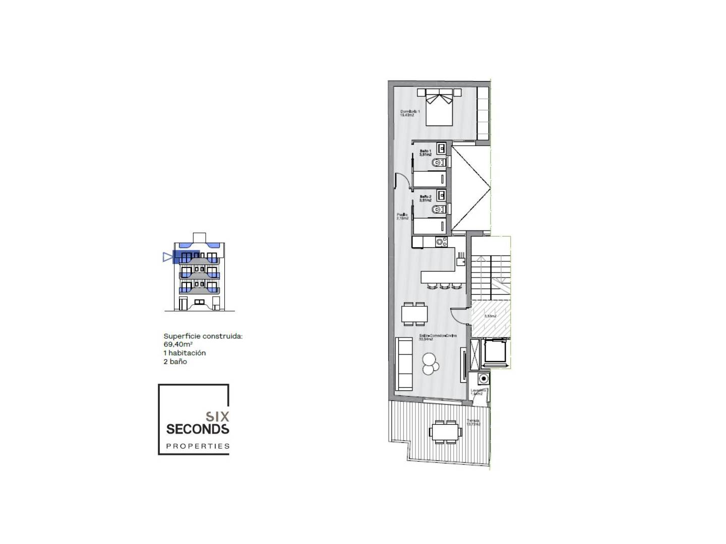 At Six Seconds Properties we present this exclusive collection of seven contemporary apartments in the heart of Torrevieja , where modern design , brightness , and urban convenience blend in perfect harmony. Located in a privileged area , this development is just 1,000 meters from Playa del Acequión and surrounded by all essential services, offering a sophisticated yet practical lifestyle. Each home features spacious interiors , high-quality finishes , and a carefully planned layout that guarantees comfort and well-being. The east-facing orientation provides sunny spaces throughout the day, while the exclusive rooftop pool with a sun lounger area and integrated bench turns this residential complex into a true Mediterranean oasis. The development has different typologies: ground floor with 2 bedrooms and 2 bathrooms , intermediate floors with 2 bedrooms and 2 bathrooms , and two penthouses with 1 bedroom and 2 bathrooms with private terraces ideal for enjoying the Costa Blanca climate. In addition, the building includes an elevator with access to all floors, parking for bicycles and electric scooters , as well as pre-installation for solar panels and a communal satellite dish , offering the perfect balance between coastal charm and modern urban living .