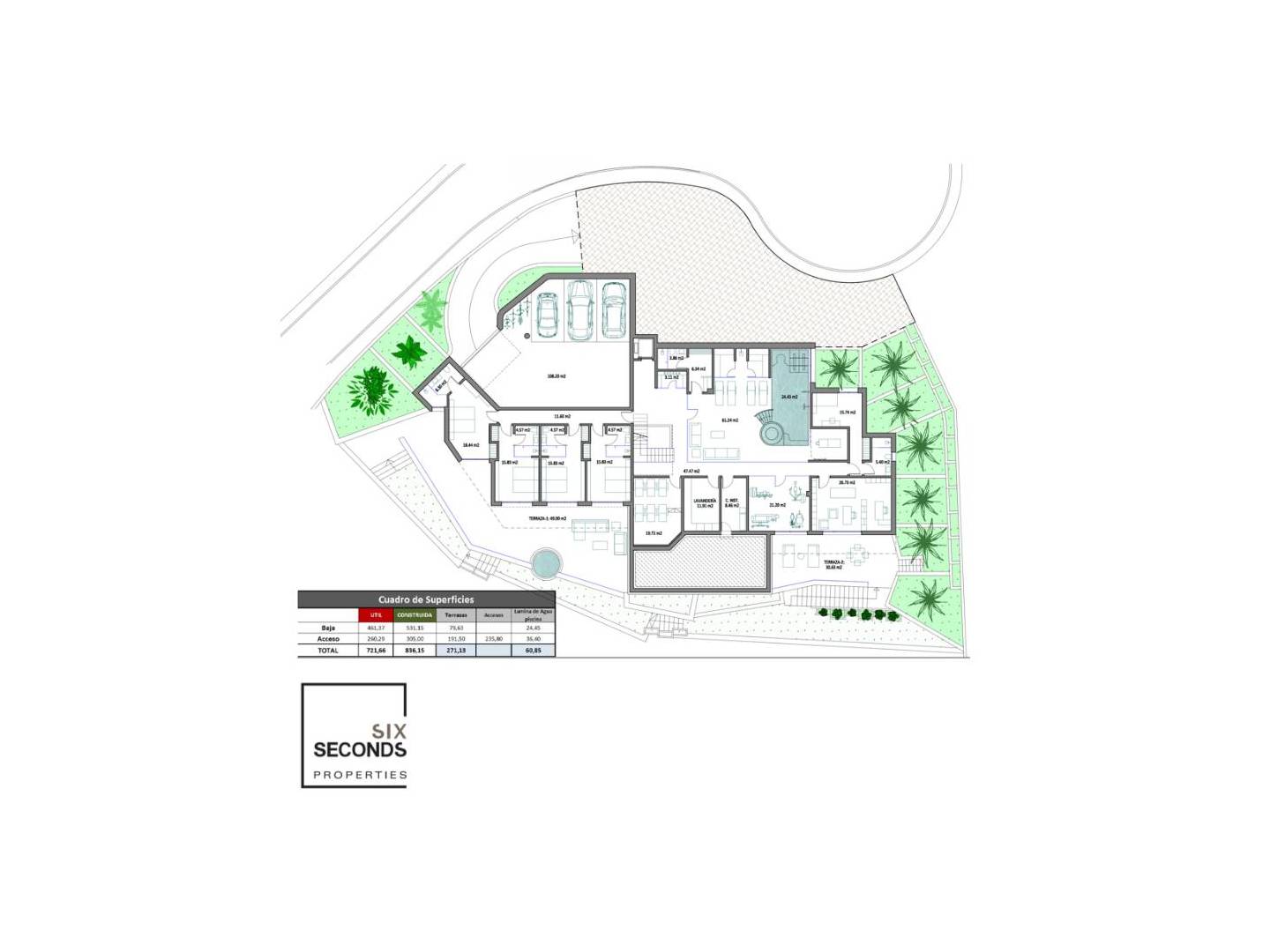 The ground floor offers a genuine wellness and entertainment center with a wine cellar, gym, cinema room, spa, sauna, and 24.45 m² indoor pool . It also features a six-car garage , ample storage areas, and four en-suite bedrooms with access to a private terrace with a Jacuzzi and chill-out area , surrounded by landscaped gardens .