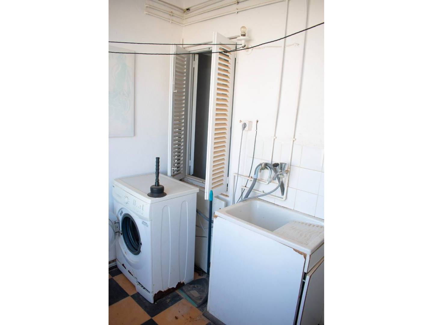 The 105 m² property features three bedrooms , a bathroom , a separate kitchen , and a utility room . It is in need of complete renovation , offering endless possibilities for design and expansion . The terrace could be opened up to enlarge the living room , a second bathroom could be created , or the interior spaces could be reconfigured to enjoy a modern, open-plan concept, always with sea views as a backdrop.