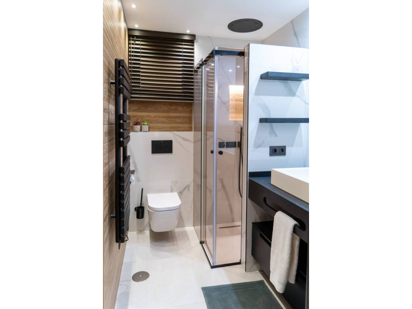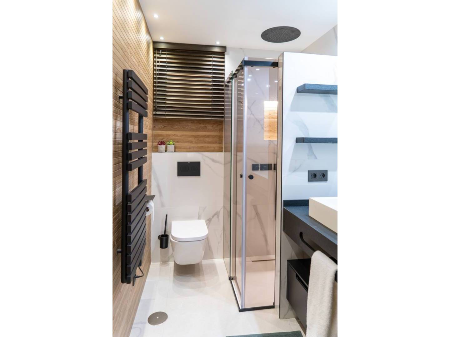 The property features two spacious bedrooms , two full bathrooms (one en suite), and a bright living-dining room with direct access to a terrace offering pleasant views of the garden area . The open-plan American-style kitchen , fully equipped with premium appliances , integrates seamlessly into the main space, creating a modern and functional environment.
