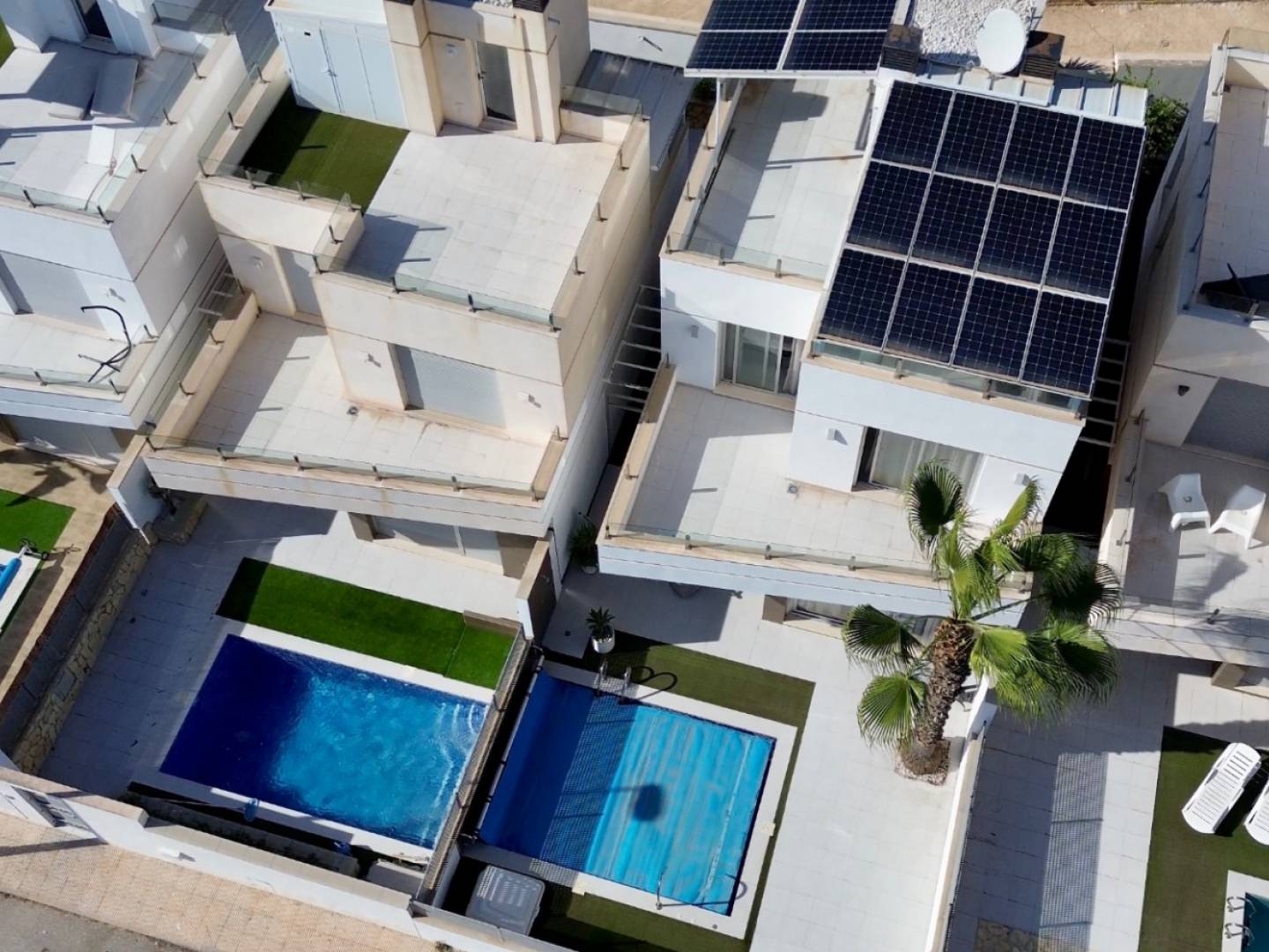 Discover this fantastic semi-detached villa located in the prestigious Lomas de Cabo Roig / Los Dolses area (Orihuela Costa) . Built in 2016 , it offers 125 m² distributed over three floors on a private 230 m² plot, combining elegance, comfort, and privacy. On the ground floor, a bright living room with underfloor heating , a fully equipped kitchen , and a bedroom with an en-suite bathroom create an ideal environment for everyday living. Upstairs, two spacious en-suite bedrooms open onto a glazed terrace with sea views , perfect for enjoying the Mediterranean climate year-round. Outside, the property boasts a private swimming pool , a terrace ideal for gatherings and barbecues , and a private east-west facing garden that guarantees natural light in all seasons. The villa includes air conditioning , underfloor heating , built-in wardrobes , a storage room , terraces, and electric heating , and is in impeccable condition. A unique property for those seeking exclusivity, comfort and energy efficiency in one of the most sought-after areas of the Costa Blanca.