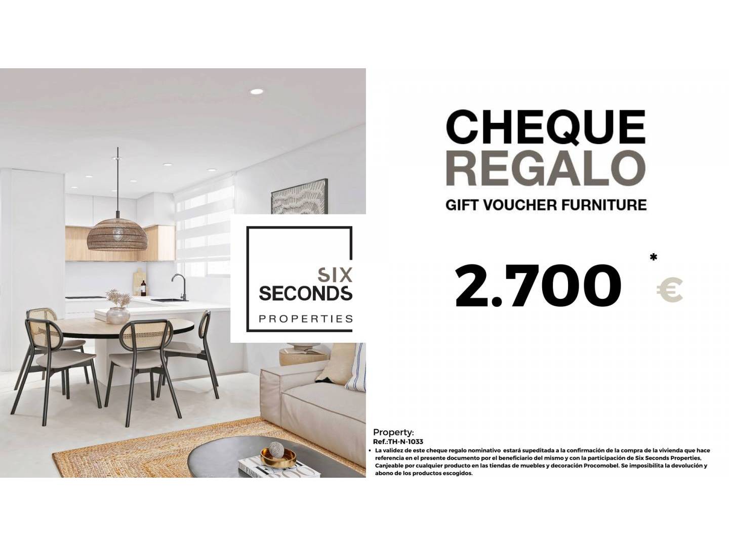 At Six Seconds Properties we help you turn your new property into the house of your dreams, giving you a gift voucher for furniture in the amount of €1,900 and a technical visit to the home, where our technical team will advise you on the possibilities of improving your the House. Totally free!!