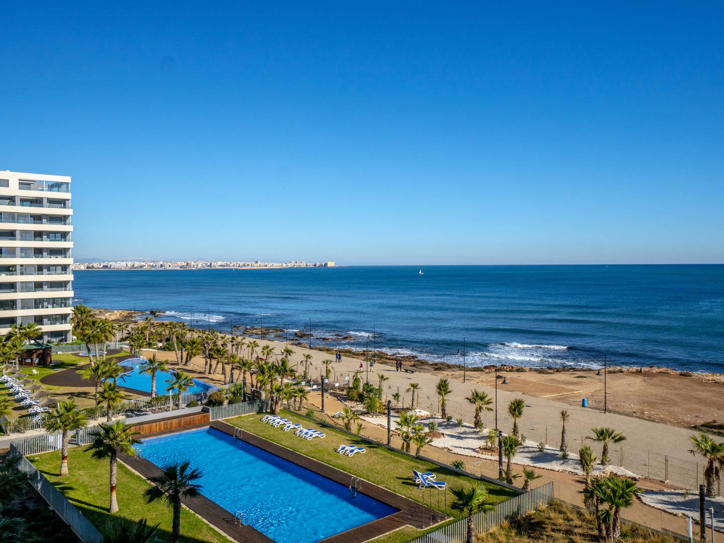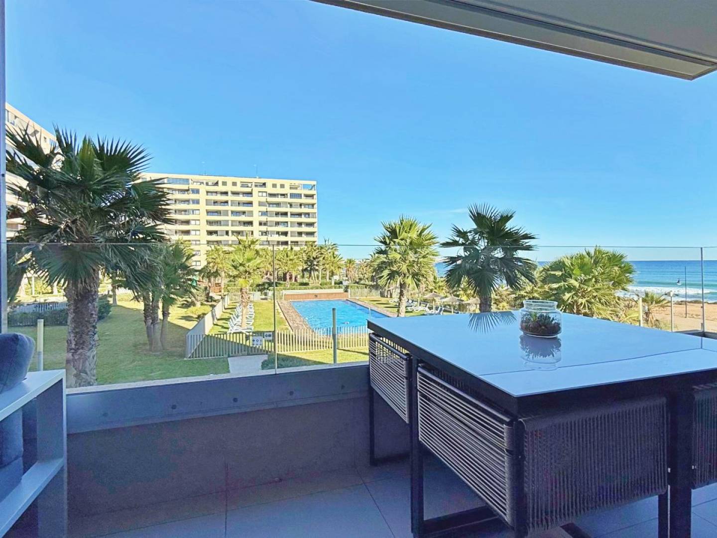 This elegant 2-bedroom, 2-bathroom apartment is located frontline, offering stunning open sea views. Its modern and bright design creates a cozy and relaxing atmosphere, ideal both for year-round living and for enjoying holiday stays. The apartment is sold fully furnished, equipped with high-quality furniture in harmonious tones and wooden details that add warmth and style. The layout is functional and comfortable, with spacious and well-utilized areas. In the area, you will find pools, including a heated pool, and a paddle tennis court, perfect for enjoying leisure time and sports activities without leaving the complex. This property also includes underground parking and a private storage room, providing additional practicality to your living experience. Located in Punta Prima, one of the most sought-after areas of the Costa Blanca, the apartment offers a peaceful and safe environment, close to the beach, with easy access to supermarkets, restaurants, bars, and local services. The area is ideal for sea and nature lovers and is a short drive from shopping centers, golf courses, and other Costa Blanca attractions.