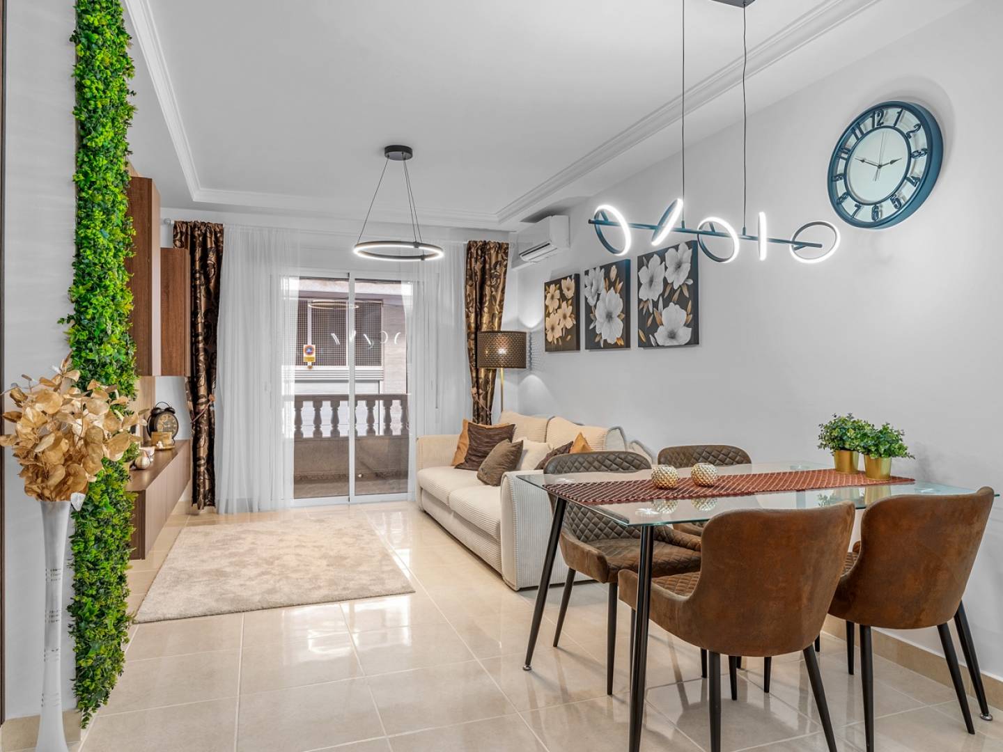 Discover this beautiful ground-floor apartment located only 150 metres from Los Locos Beach in Torrevieja, one of the most desirable areas of the Costa Blanca. Perfect for those dreaming of living by the sea, surrounded by the vibrant Mediterranean atmosphere, with a charming promenade full of restaurants, cafés, shops, and bars just a short stroll away. The property is situated on a quiet street, offering peace and privacy while remaining close to all the attractions of the coastal city. It features both a balcony and a patio on the same level, providing plenty of natural light and additional space to relax, dine, or enjoy the outdoors. The apartment offers two bedrooms, two bathrooms, and a spacious living room with an open-plan kitchen leading directly to the balcony. It has been completely renovated, including new plumbing and electrical installations, ensuring modern comfort and reliability. The interior is finished in a modern, minimalist style, blending elegant white tones with warm wood and touches of natural greenery. The apartment is sold partially furnished, as shown in the photos, leaving room for the new owner to personalize the space to their own taste. Thanks to its prime location between Playa del Cura and Playa de Los Locos, this property is an excellent choice both as a permanent residence and as an investment for holiday rentals, with great potential for year-round income. Contact us today for more information or to arrange a viewing this apartment truly captures the essence of Mediterranean living!