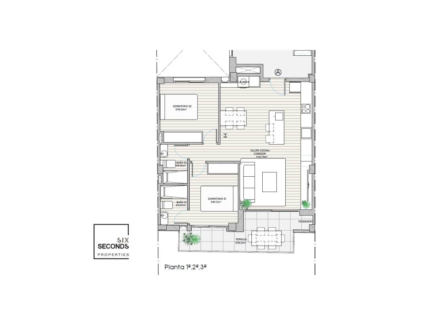 The apartments—available on different floors and with layouts of two bedrooms and one or two bathrooms , depending on the unit—feature state-of-the-art technology and absolute comfort: underfloor heating throughout , enhanced sound insulation , improved thermal insulation , ducted air conditioning , an aerothermal hot water system , LED lighting , Bosch appliances , leading-brand faucets and sanitary ware , an induction hob , electric blinds , a high-security entrance door , luxury paint , and suspended ceilings . Each apartment also includes a private storage room of approximately 15 m² , a rare added value in the area.