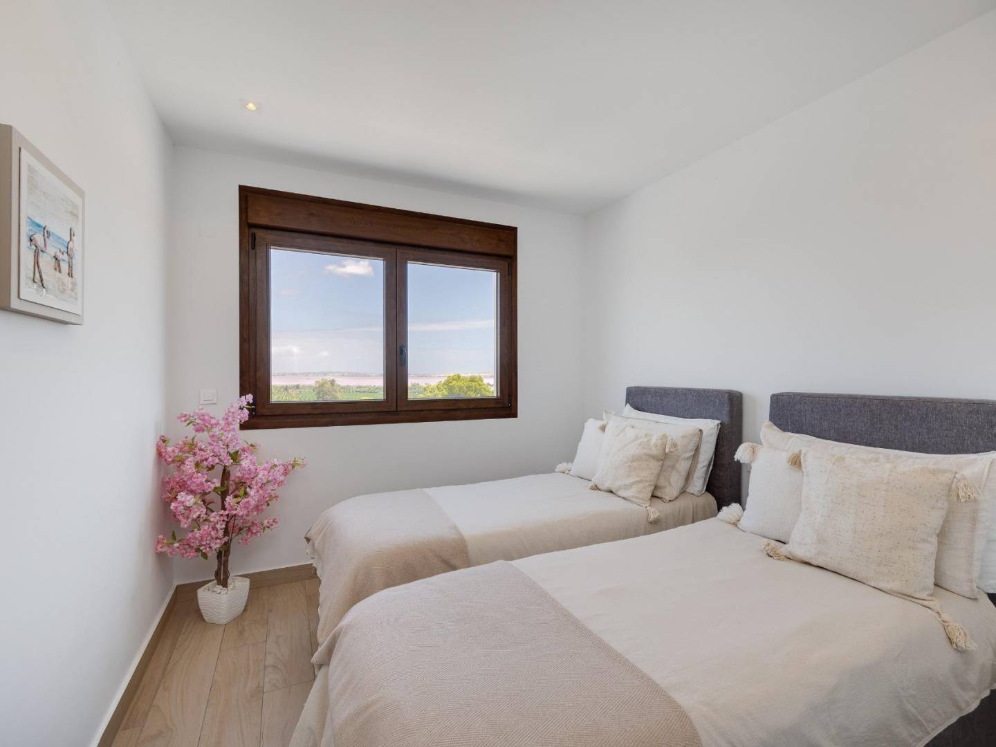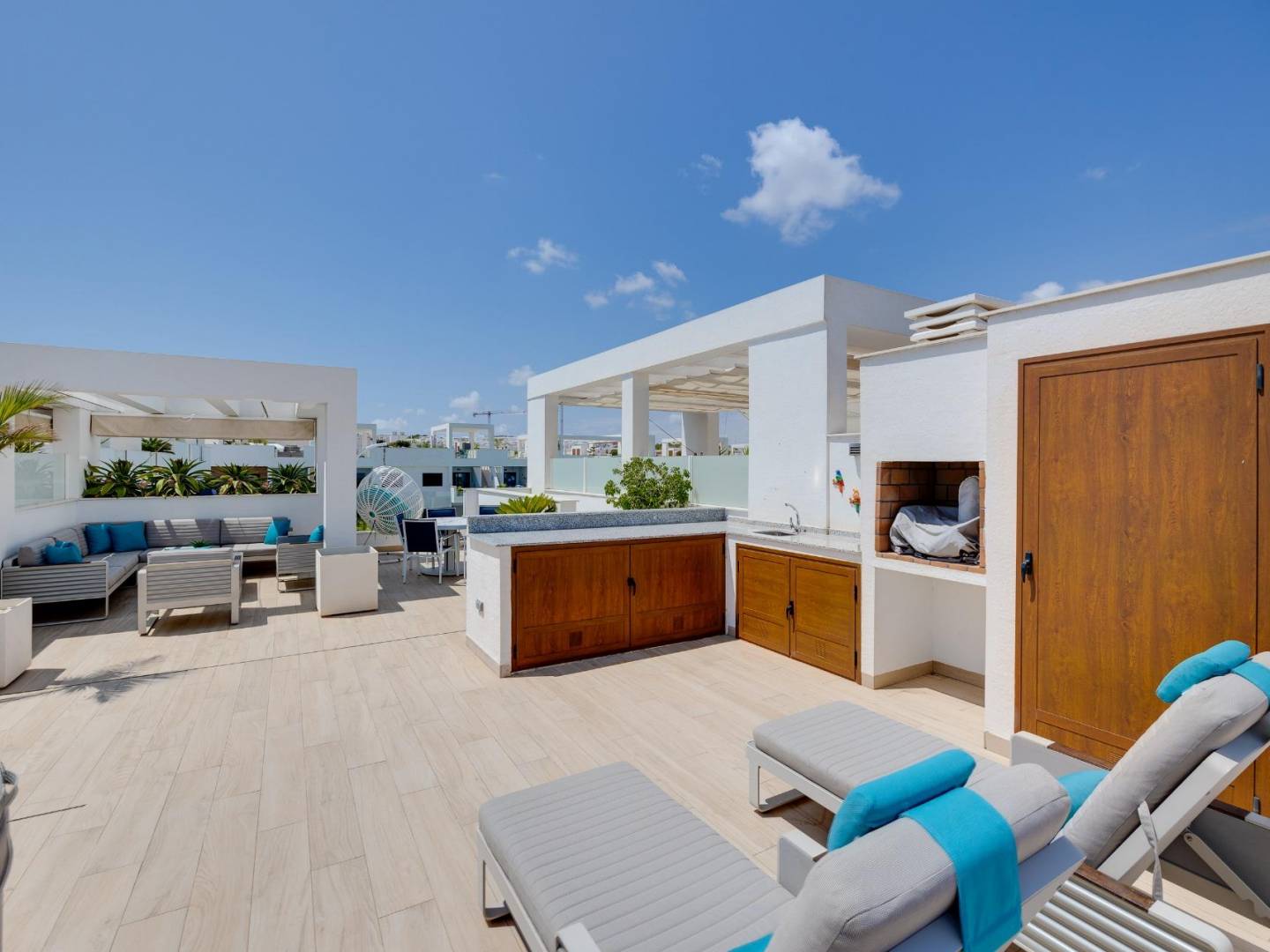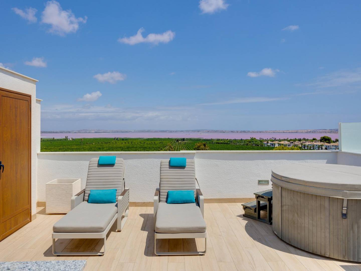 Welcome to bungalow number 52 in the prestigious Laguna Beach residential complex, built by Immosol in 2021 located in Los Balcones, Torrevieja. This nearly new property has been used only for vacations a few times throughout the year. It boasts an expansive living-dining area featuring an open-plan kitchen fully equipped with modern appliances. Step out onto your glazed terrace that leads directly to a large private solarium complete with luxurious amenities including a jacuzzi showcasing breathtaking views of Torrevieja's pink lagoon , mountains , and sea .~~The outdoor space is perfect for entertaining guests or relaxing under the sun ; it features a barbacoa (barbecue) setup alongside ample storage within its spacious American-style bar and includes pergola shades and an outdoor shower everything you need!~~This beautiful home consists of two bedrooms accompanied by two bathrooms one being en-suite to the master bedroom . The entire residence enjoys abundant natural light illuminating every corner while offering unobstructed views from all rooms .~~Included are convenient underground parking spaces along with extra storage facilities at no additional cost! Moreover, residents can indulge themselves at one of Orihuela Costas most exquisite community pools showcased beautifully in our photos .~ ~Living here means joining many satisfied neighbors who have made this their permanent abode due to comfort & quality lifestyle , while others utilize it during chosen holiday periods .~Additionally nearby: Supermarket Mercadona just steps away(400m), excellent bus connections enhancing accessibility between Torrevieja & Orihuela Costa etc., as well access via AP-7 towards Alicante Airport Ideal positioning indeed!~