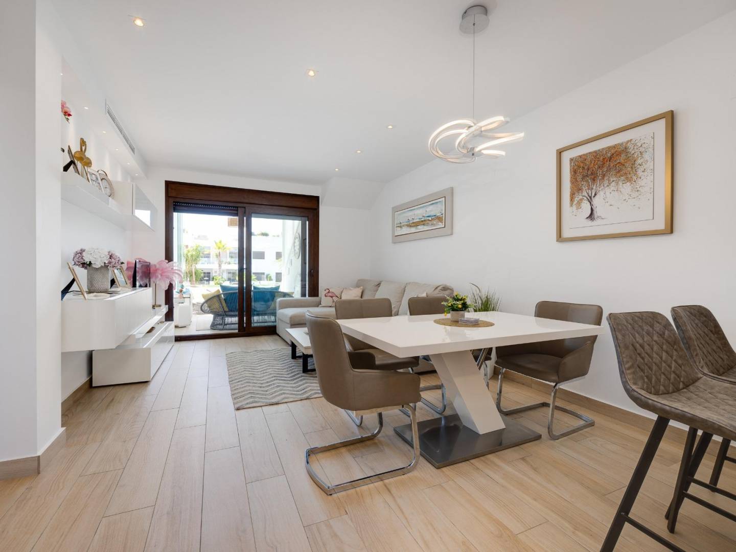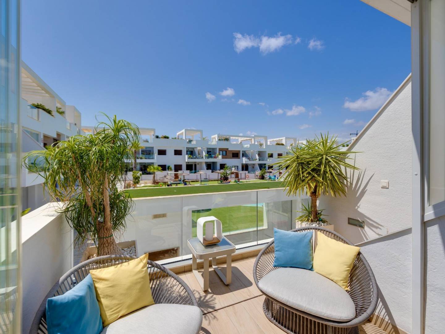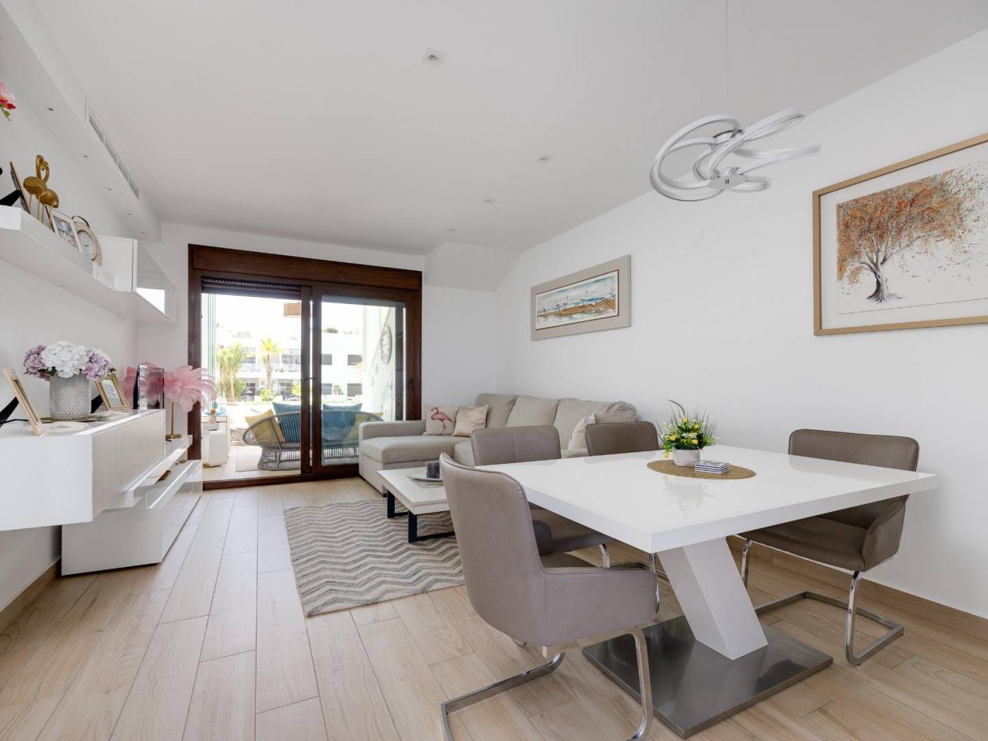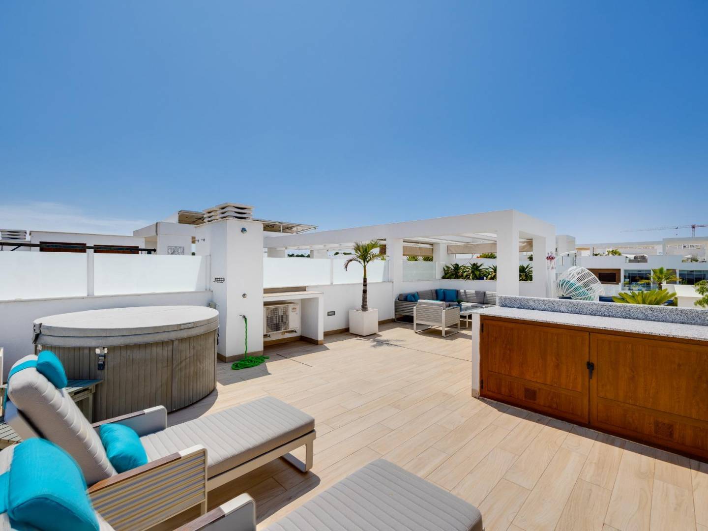 Welcome to bungalow number 52 in the prestigious Laguna Beach residential complex, built by Immosol in 2021 located in Los Balcones, Torrevieja. This nearly new property has been used only for vacations a few times throughout the year. It boasts an expansive living-dining area featuring an open-plan kitchen fully equipped with modern appliances. Step out onto your glazed terrace that leads directly to a large private solarium complete with luxurious amenities including a jacuzzi showcasing breathtaking views of Torrevieja's pink lagoon , mountains , and sea .~~The outdoor space is perfect for entertaining guests or relaxing under the sun ; it features a barbacoa (barbecue) setup alongside ample storage within its spacious American-style bar and includes pergola shades and an outdoor shower everything you need!~~This beautiful home consists of two bedrooms accompanied by two bathrooms one being en-suite to the master bedroom . The entire residence enjoys abundant natural light illuminating every corner while offering unobstructed views from all rooms .~~Included are convenient underground parking spaces along with extra storage facilities at no additional cost! Moreover, residents can indulge themselves at one of Orihuela Costas most exquisite community pools showcased beautifully in our photos .~ ~Living here means joining many satisfied neighbors who have made this their permanent abode due to comfort & quality lifestyle , while others utilize it during chosen holiday periods .~Additionally nearby: Supermarket Mercadona just steps away(400m), excellent bus connections enhancing accessibility between Torrevieja & Orihuela Costa etc., as well access via AP-7 towards Alicante Airport Ideal positioning indeed!~