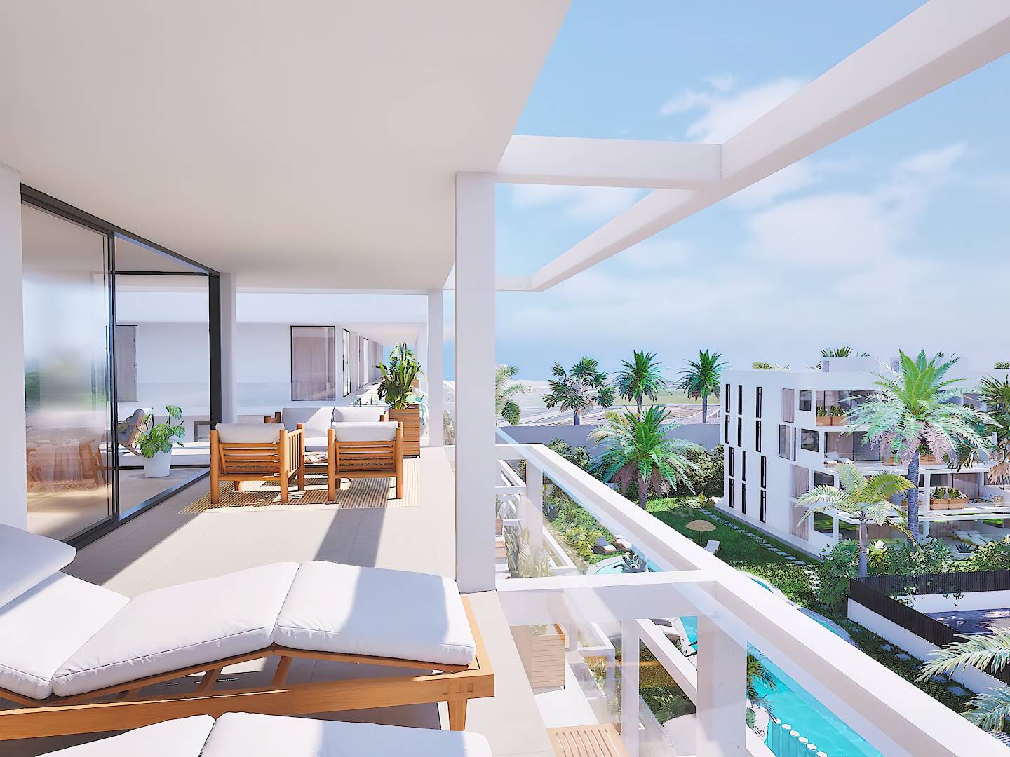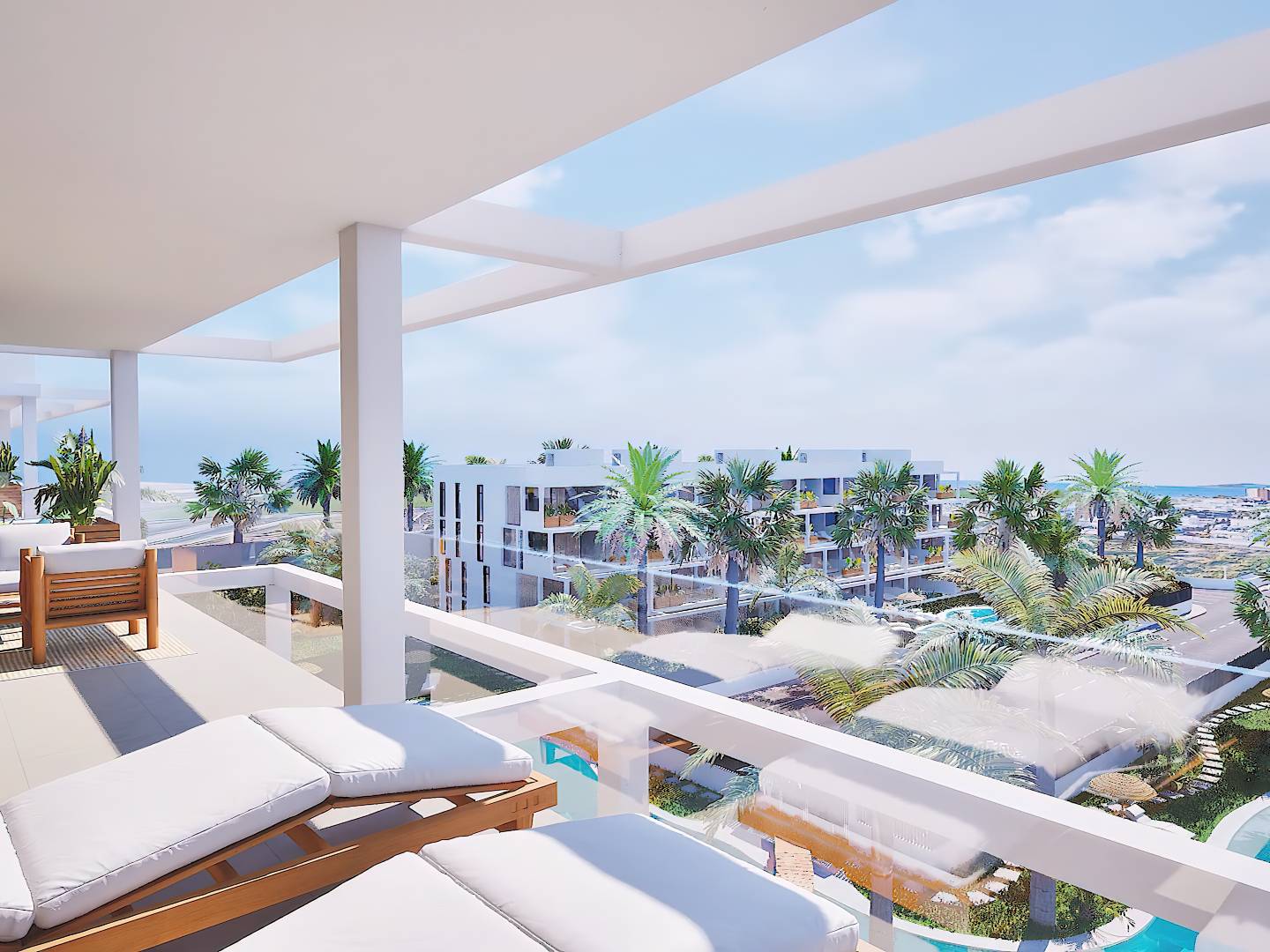 These luxurious 2 or 3 bedroom, 2 bathroom apartments are located just 650 meters from the beaches of Mar de Cristal. Each features a spacious living room that flows into a modern open-plan kitchen and large sliding glass doors, providing direct access to the front terrace. From there, you can enjoy beautiful mountain views, while the penthouses offer fantastic sea views. The price of these properties includes an underground parking space and a storage room, adding convenience and practicality.